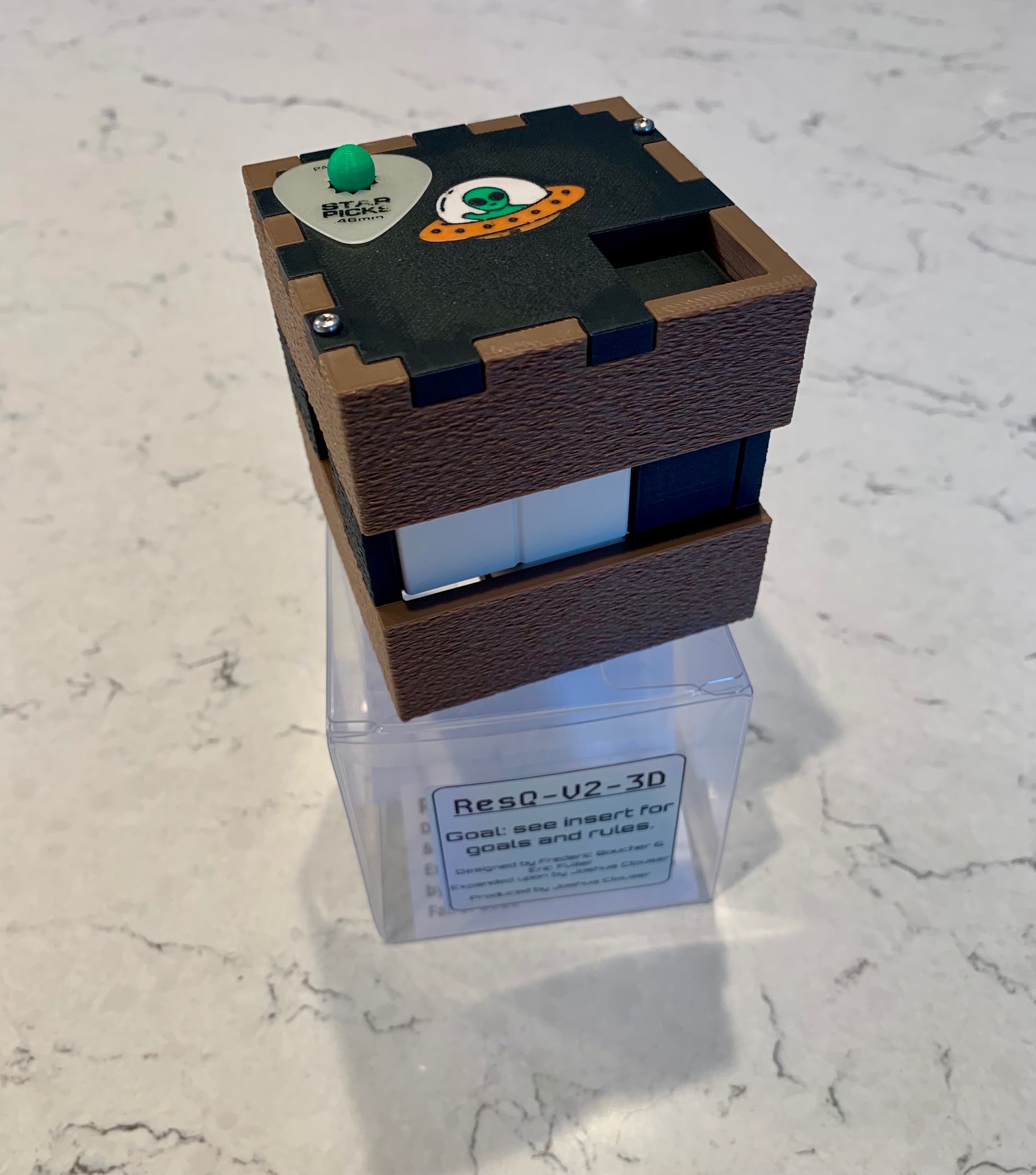 ResQ-V2-3D is a sequential discovery puzzle designed by Frederic Boucher and Eric Fuller expanded upon and reproduced by Joshua Clouser at PGHPuzzles, fall of 2025.