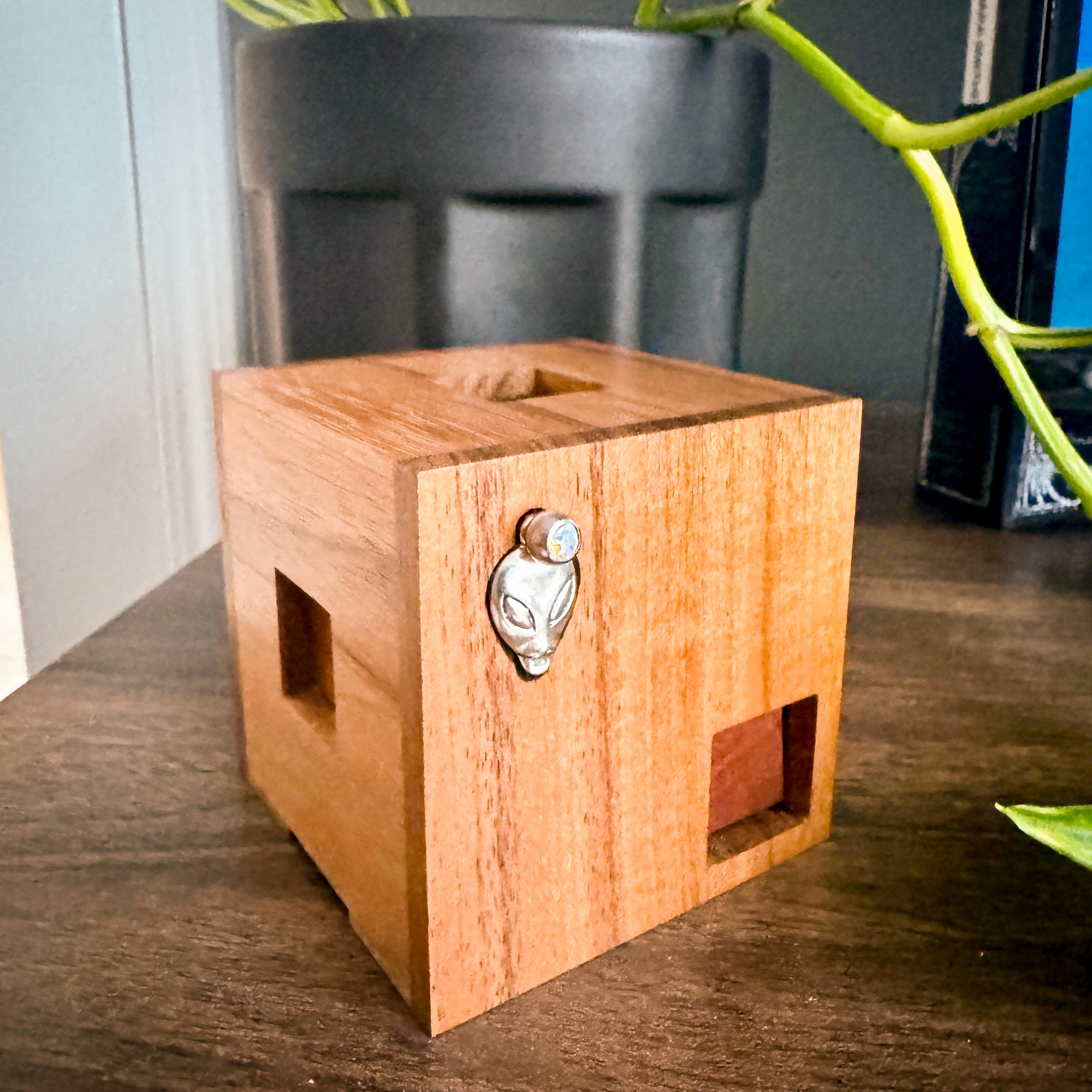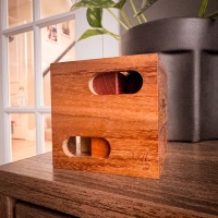 We produced ResQ in two batches. The regular batch of approximately 120 copies uses four different exotic kinds of wood for the vortex, which helps with the solution. A smaller, limited release of about 30 copies uses solid ebony for the vortex, which increases the difficulty. Both editions feature a box made from Hawaiian Koa, a scarce and difficult to obtain wood. ResQ ships in an unsolved configuration and includes a piece diagram to aid in resetting the puzzle.