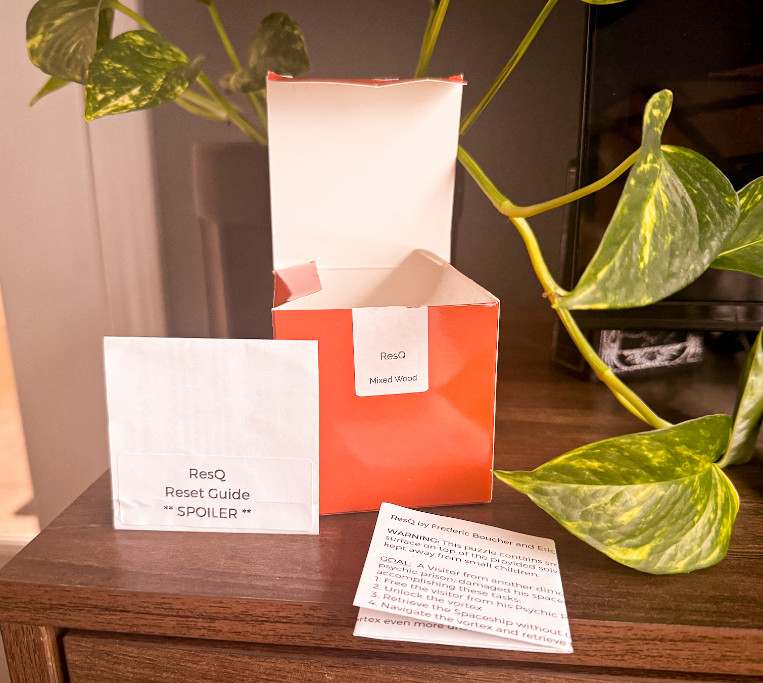 ResQ is a unique Sequential Discovery Puzzle based on Boucher's brilliant Visitor Q. We took the original design and modified it by adding additional goals, tools, and tricks. ResQ is the result of nearly three months of prototyping and features previously unseen concepts and hardware.