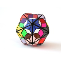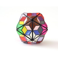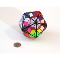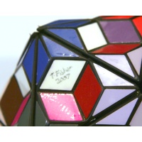 this auction is for Rhomball, one of four twistypuzzle transformations designed by Tony Fisher and sold by him at Dutch Cube Day in 2007.  it is a kilominx-type puzzle built on a Dogic core, with coloured vinyl stickers on cast resin pieces.  it is in excellent physical condition and tension is tight but turning is fairly smooth.