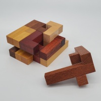 • description: a rare interlocking puzzle from 2014 featuring a 5x5x3 assembly composed of five unique pieces made from exotic woods. Despite its moderate level 2.3.4.4.3 solution, the puzzle presents a significant challenge due to its unique rotational moves, requiring solvers to navigate pieces through a central ring.
