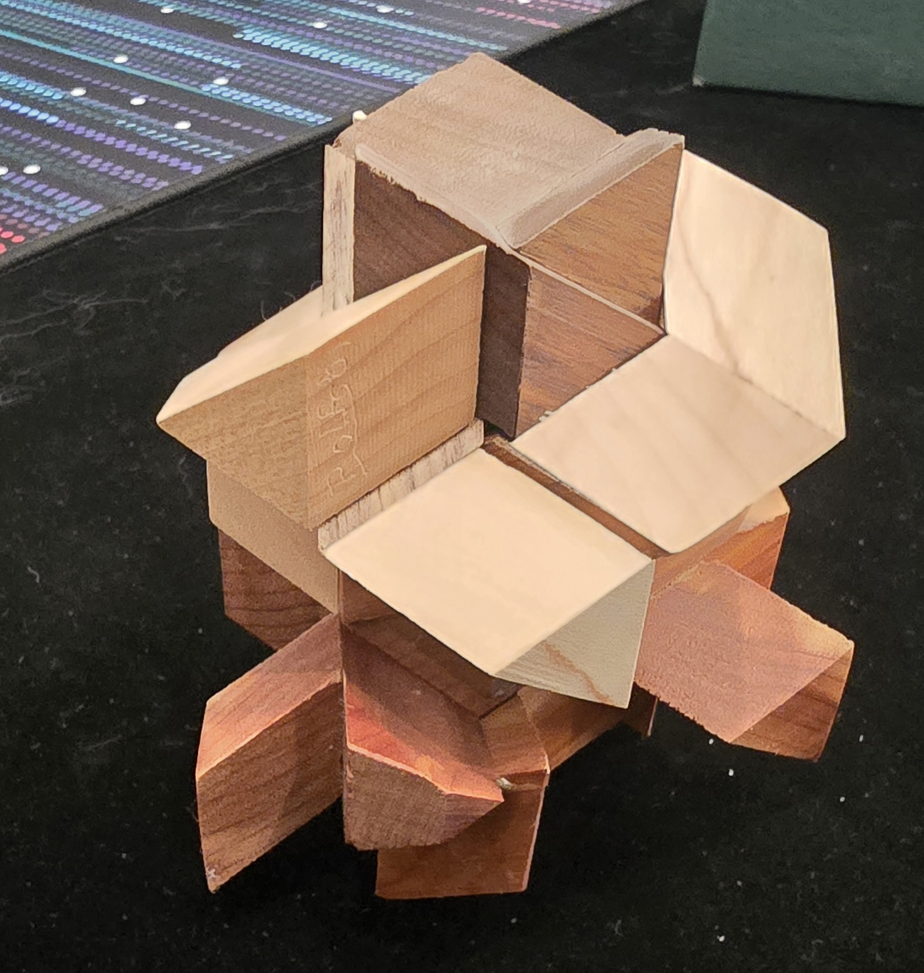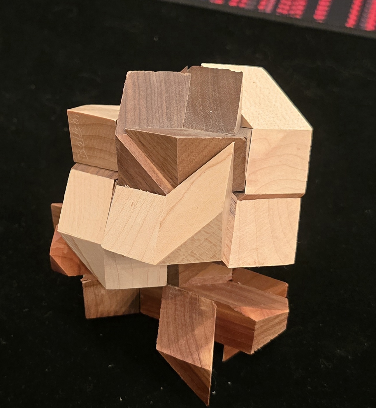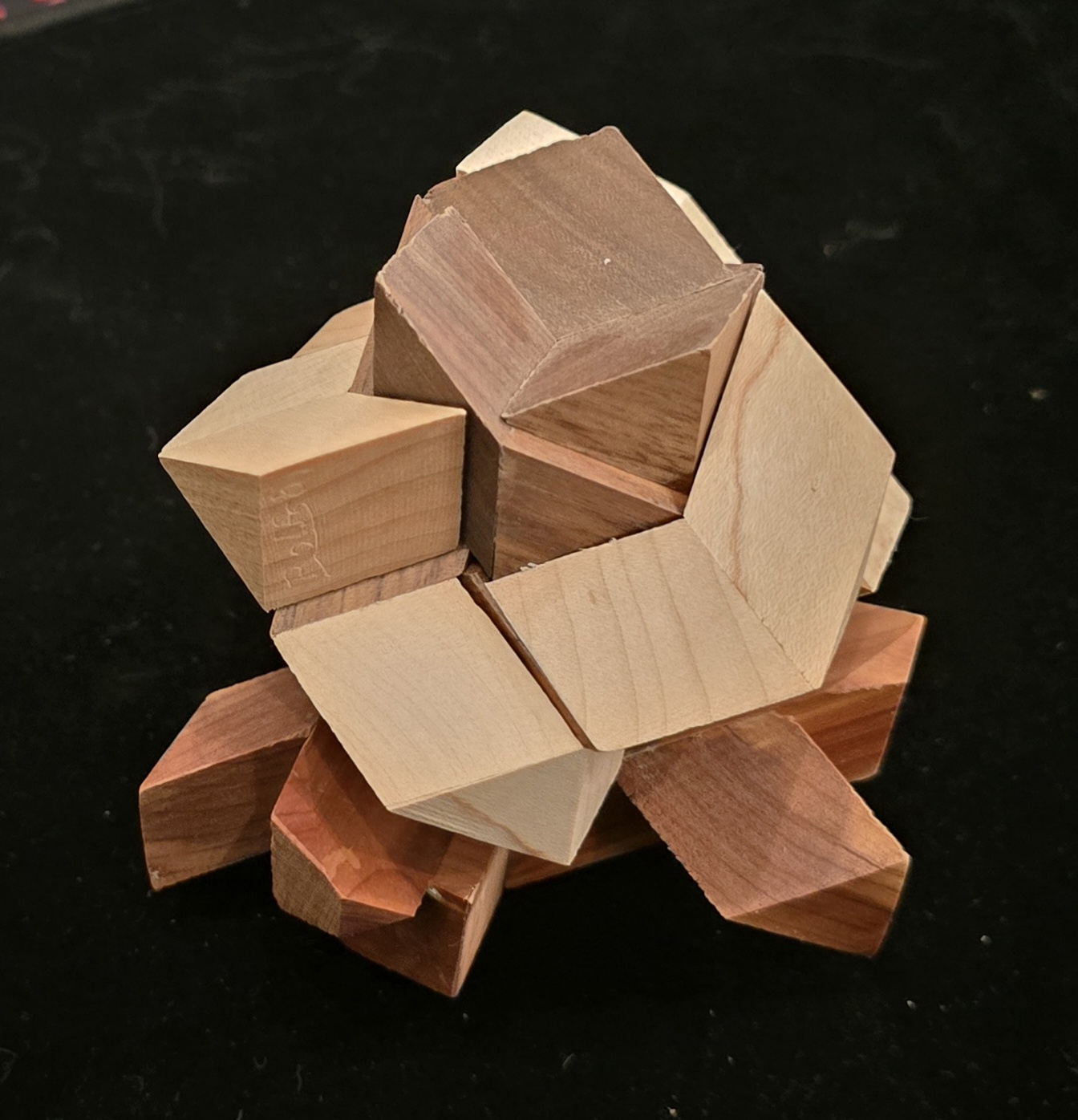The Rosebud is famous in the community for its stunning geometry and its maddening difficulty. It is composed of six identical wooden pieces that must be brought together simultaneously in a perfect, synchronized coordinate motion. Once assembled, it forms a tight, interlocking "bud" without showing any gaps.
