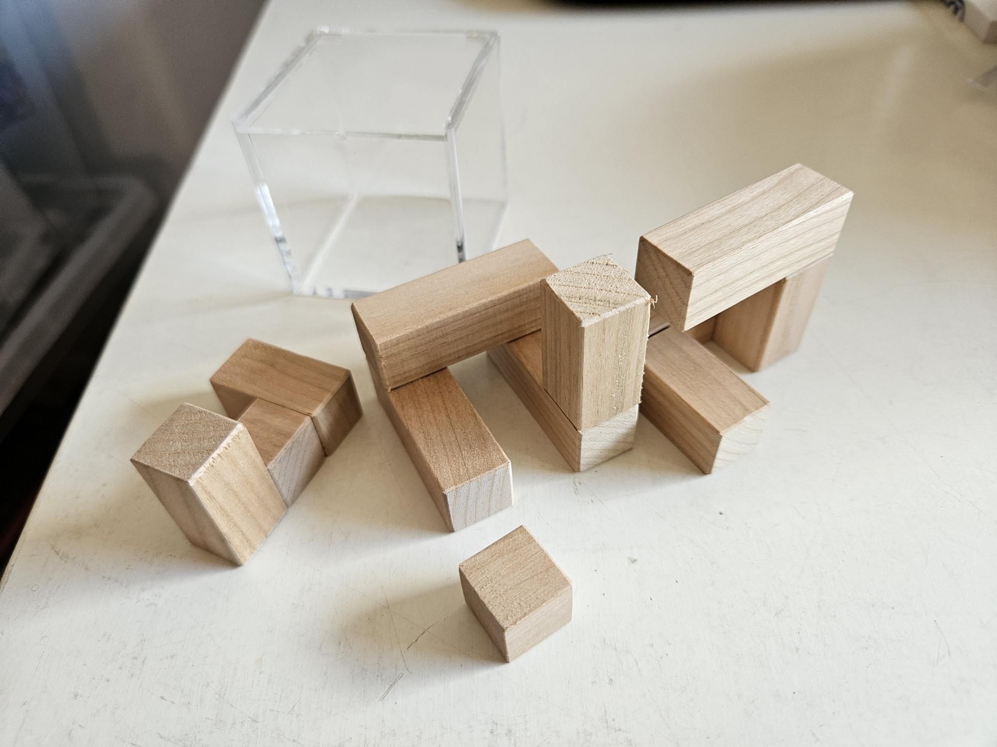 Up for auction is a TIC = turning interlocking cube "light" design by Juha Levonen and made by Bernhard Schweitzer, which was my exchange puzzle at IPP 2023 in Jerusalem. Your goal is to create a 3x3x3 cube to perfectly fit in the accompanying plastic container. In my mind it is a brain teaser to start experimenting with TIC's as it is not that difficult to solve. The puzzle is in new condition - just assembled/disassembled twice to check workability.
