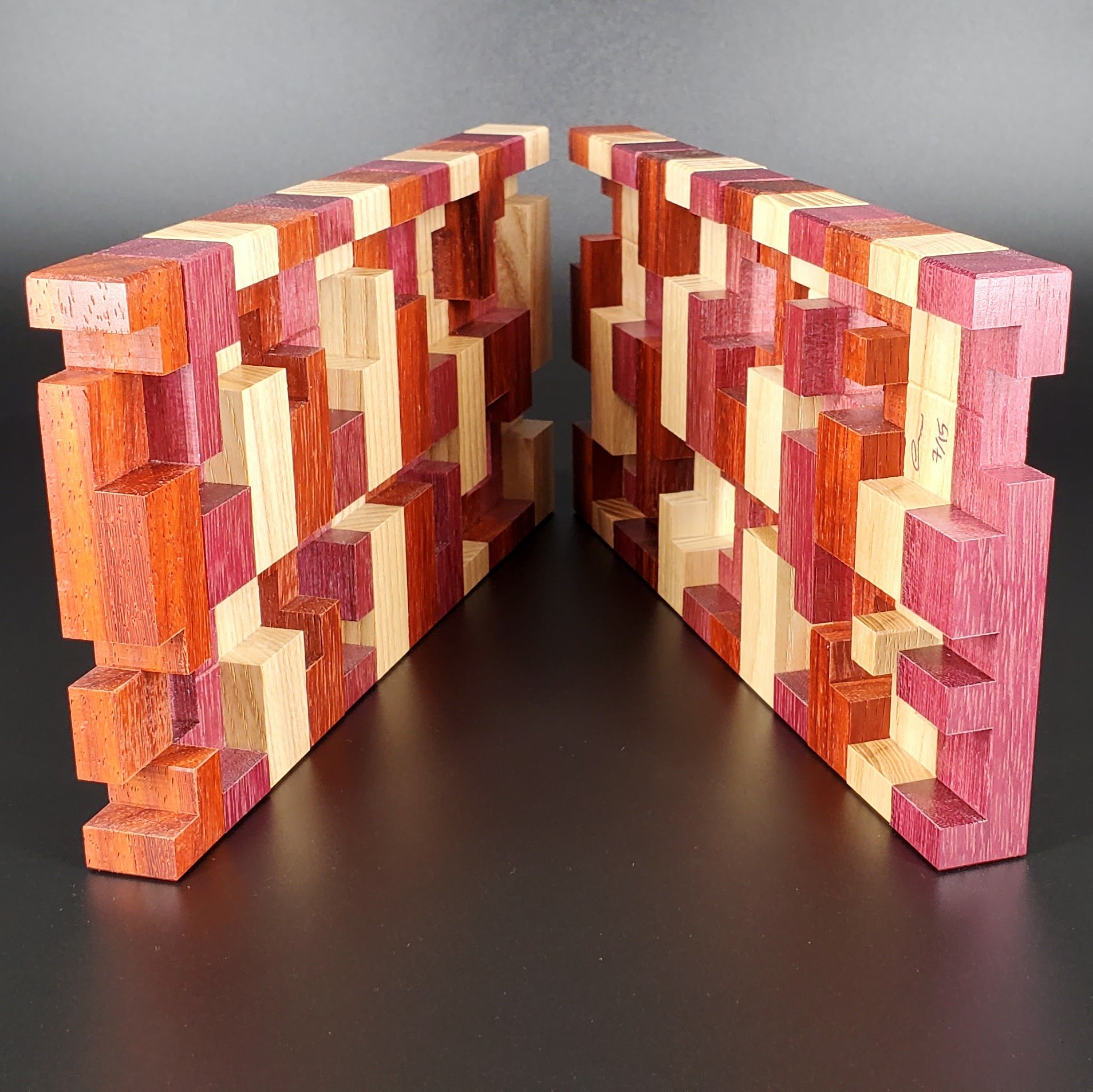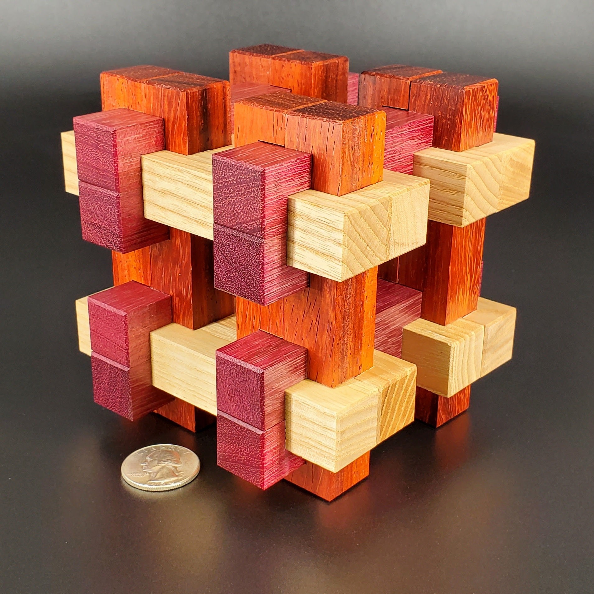 • description: A classic Cutler burr, crisp, architectural, and deceptively rigid until you find the first real movement. The solve is a clean, step-by-step disassembly where tiny shifts unlock larger motions, and reassembly demands the same disciplined sequence in reverse, with a few easy trap states along the way. Eric’s bright wood selection also makes it a stunning display piece.