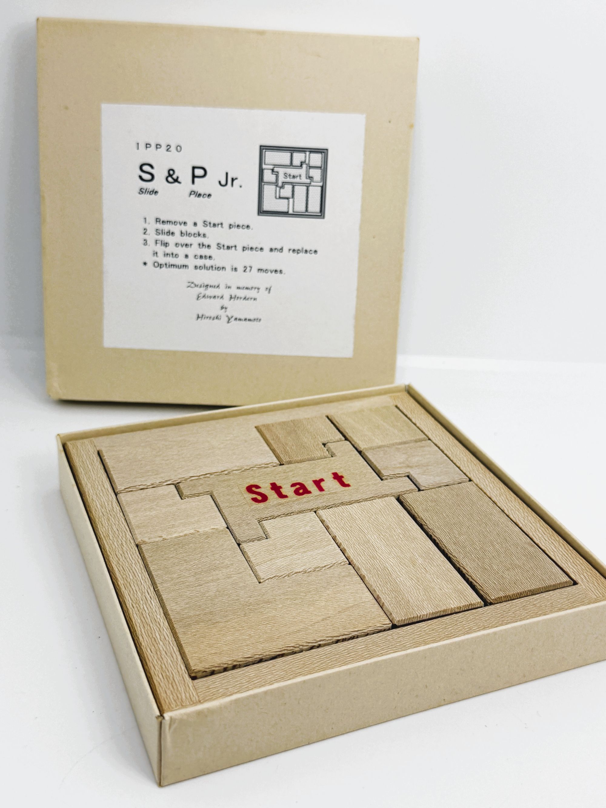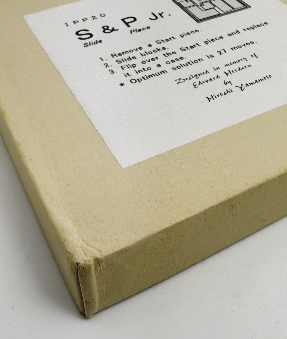 The puzzle is made from wood. Designed by Hiroshi Yamamoto in memory of Edward Hordern. S&P stands for Slide and Place.