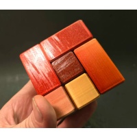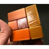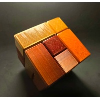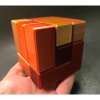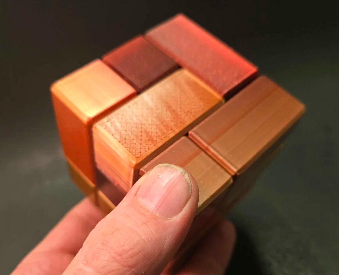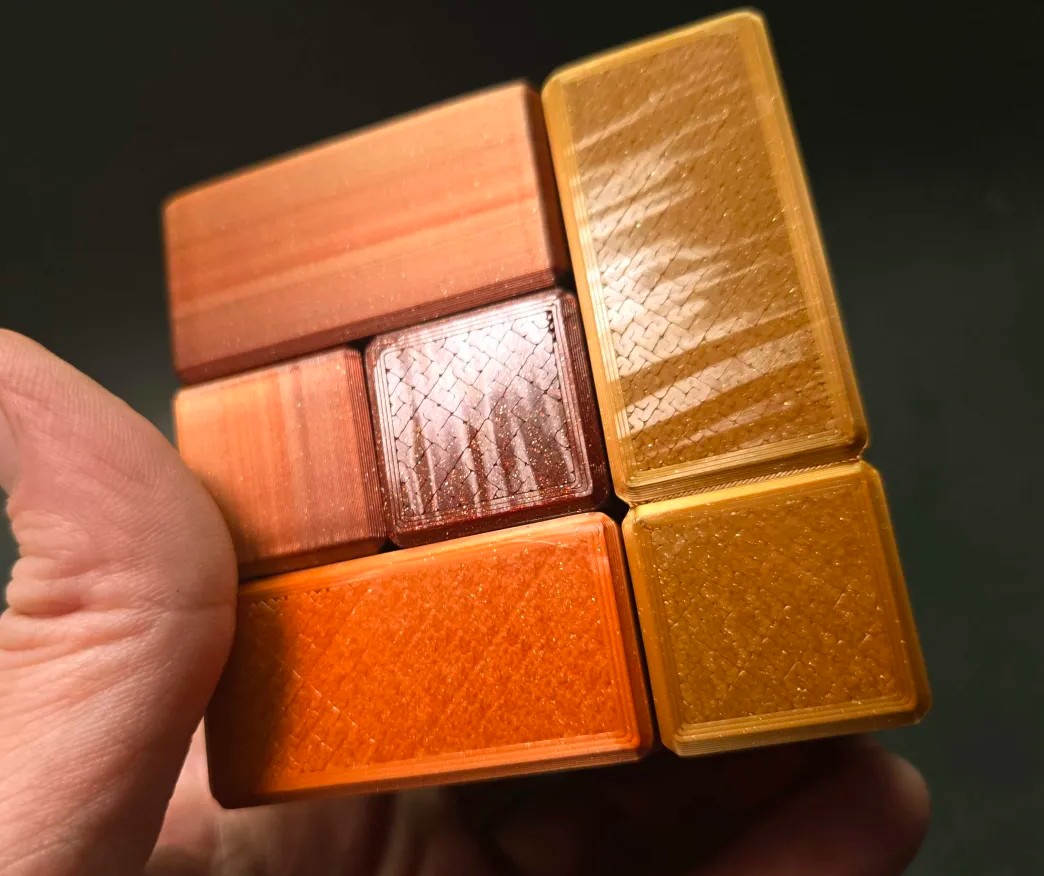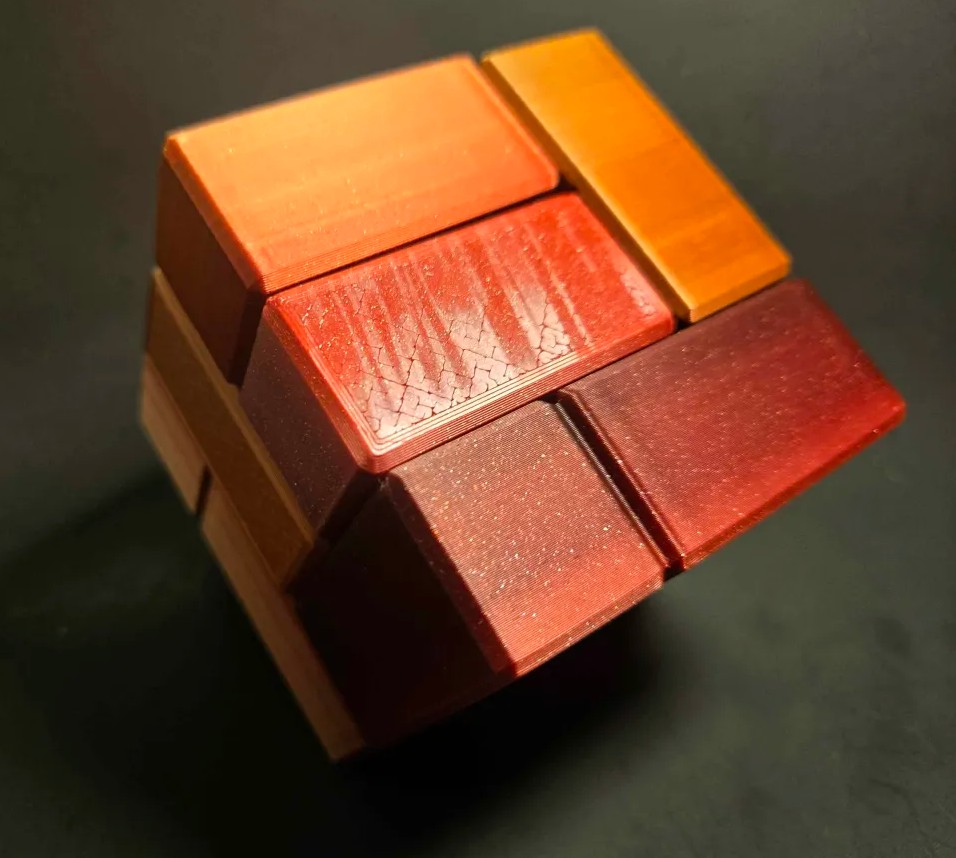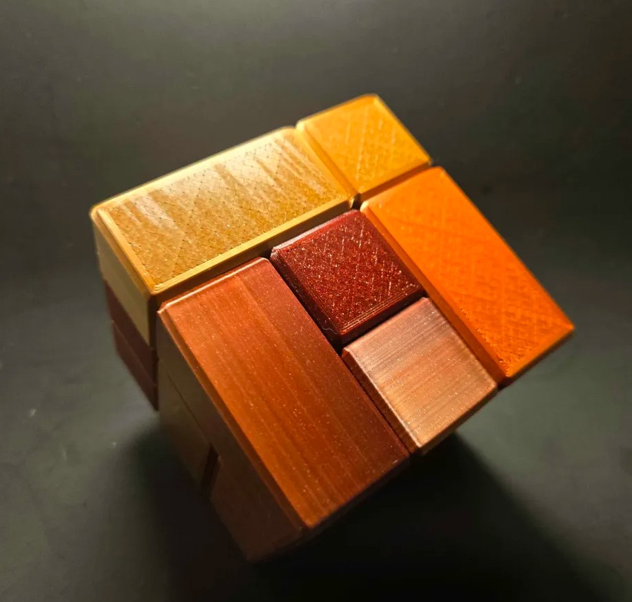 This is the final form of Scion of the Tesseract using a special black, gold, and red filament that is set to blend two colors outside to make a wood look with wood grain pattern, and an inside with grain pattern and snakeskin texture.
