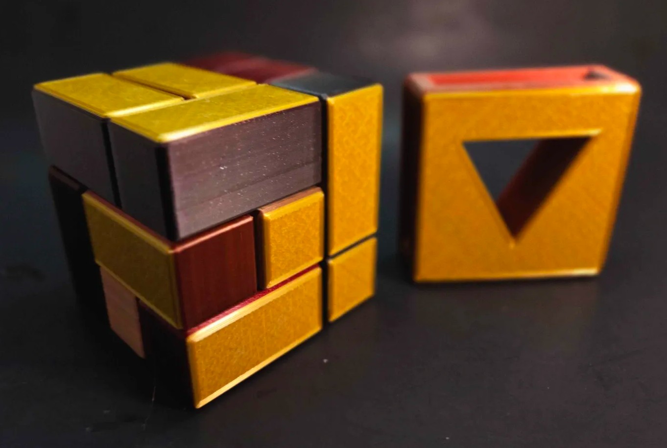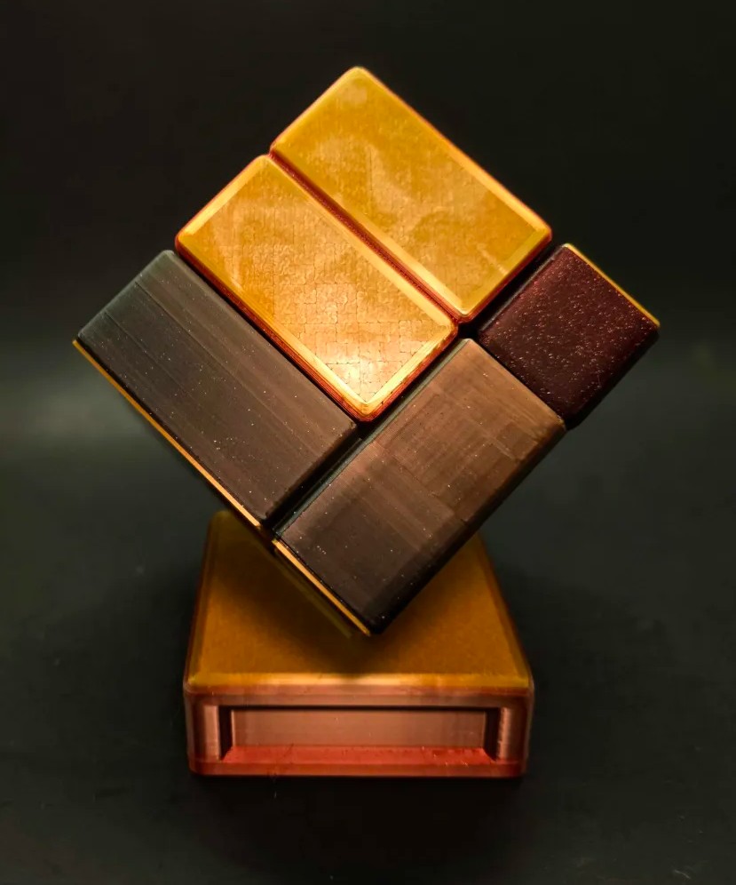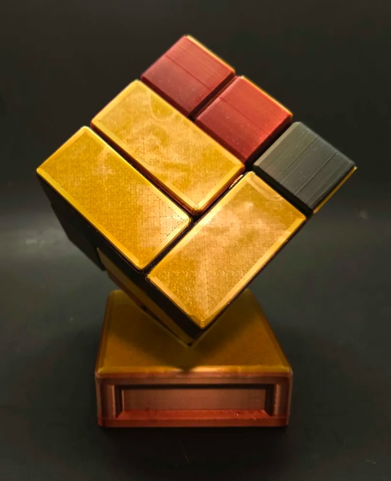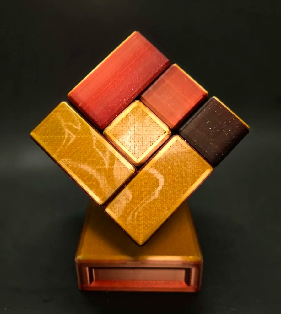 This is the final form of Scion of the Tesseract using a special black, gold, and red filament that is set to blend two colors outside to make a