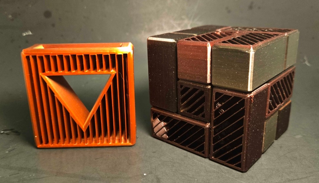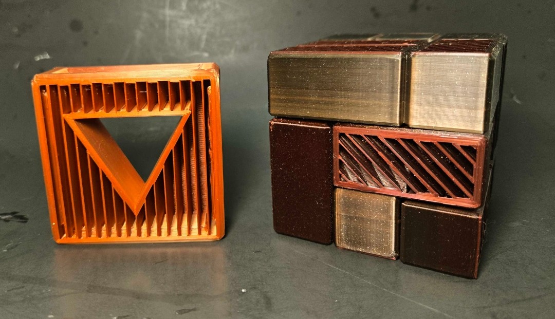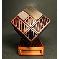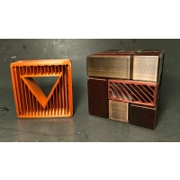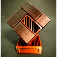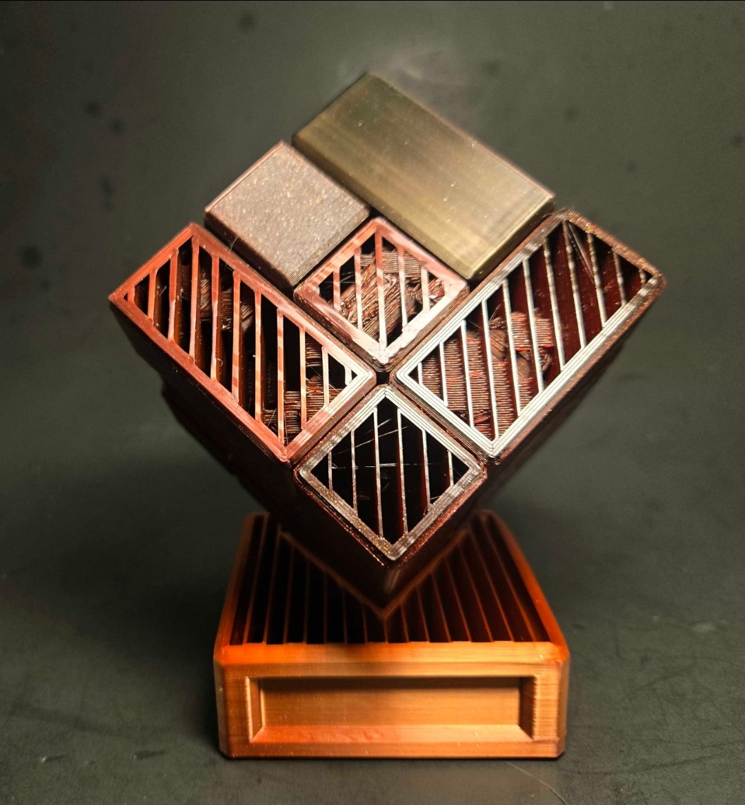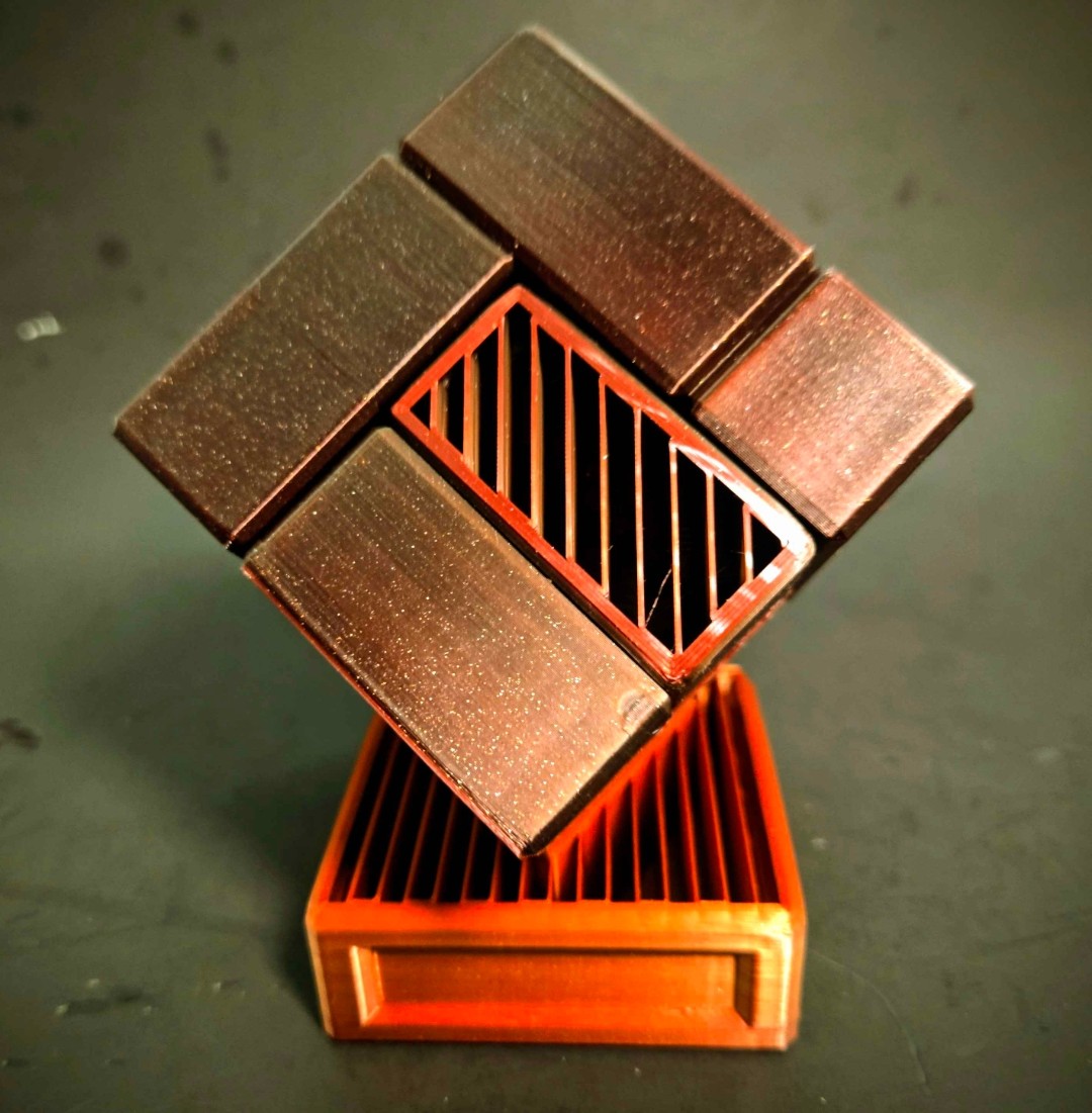 This is the final form of Scion of the Tesseract using a special black, gold, and red filament that is set to blend two colors outside to make a Ebony wood look with multiple vented faces adorned with a Bloodwood Finish, and an inside with Copper plated vented internals, all with wood grained edges.