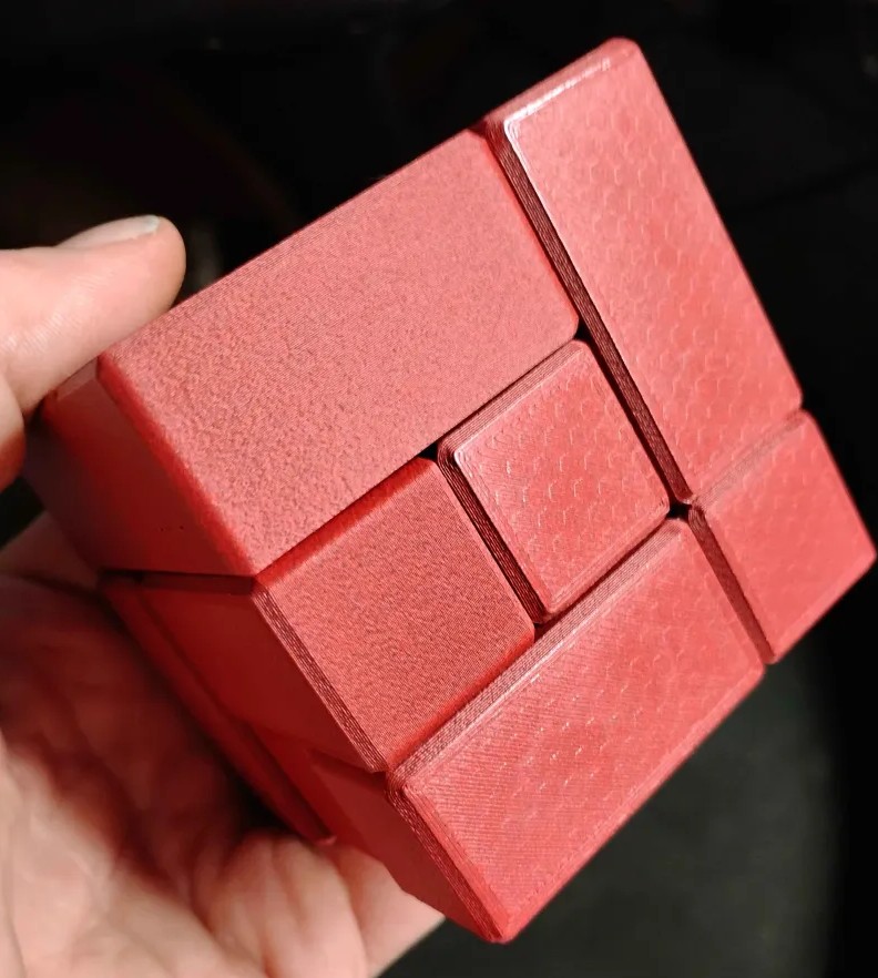 This is the fully refined Scion of the Tesseract using a Red Carbon Fiber filament with circle style patterns on it themed by the fear of holes.