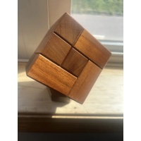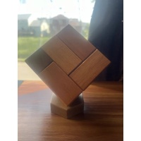 Described by by Juno/Pluredo: The puzzle may be categorized into Juno's disguised series, following Sequential Discovery Burred Box, SDBBB, and SDBB Master. His first intention was to produce a simple 3 x 3 x 3 cube puzzle but after he prepared timber stocks, he changed his mind and started adding features to make it into a sequential discovery puzzle. He usually changes the design and function of details while continuing to manufacture such kind of puzzles, and it was not until June of this year that the final draft of one of the part of the puzzle was decided. We had a chance to lose the entire product until the very last step of the production.