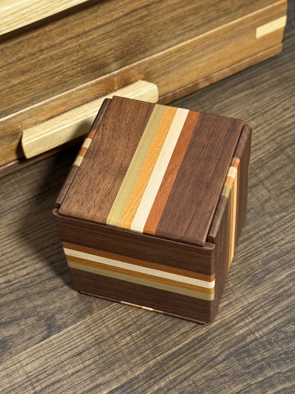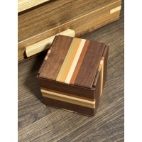The Secret Box IV is a meticulously handcrafted puzzle box constructed of magnolia, walnut, and other beautiful woods. The solve gives you quite the satisfaction, not by any particular surprise, but by it's rhythmic nature and sequence.