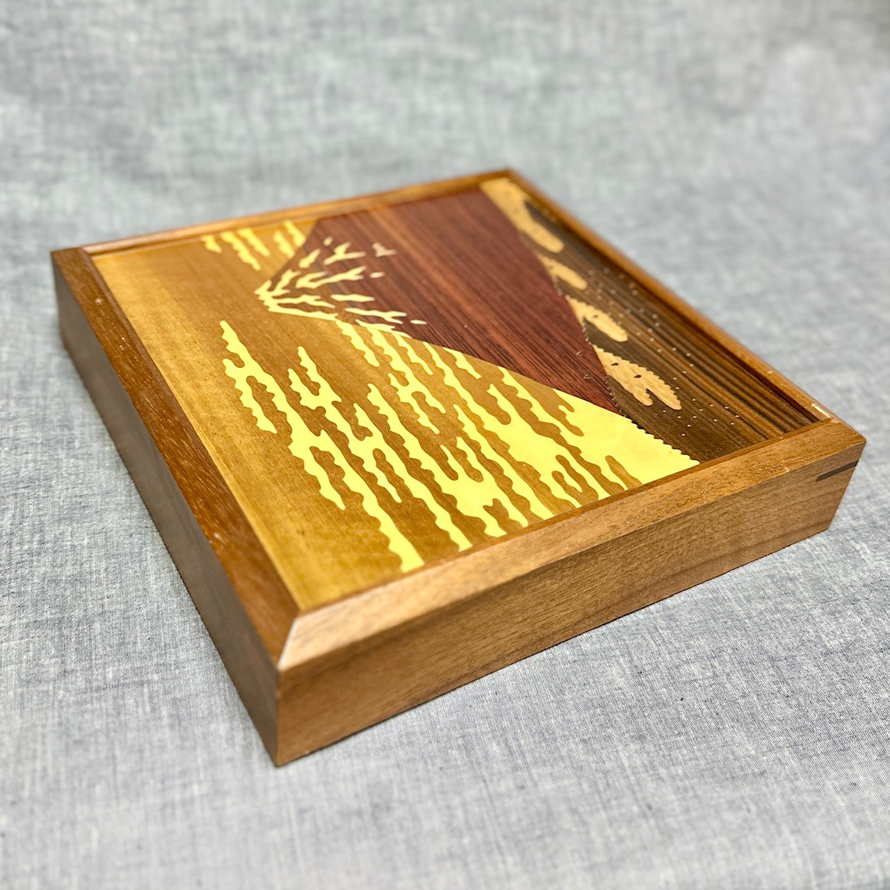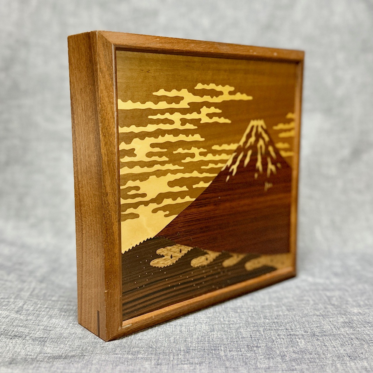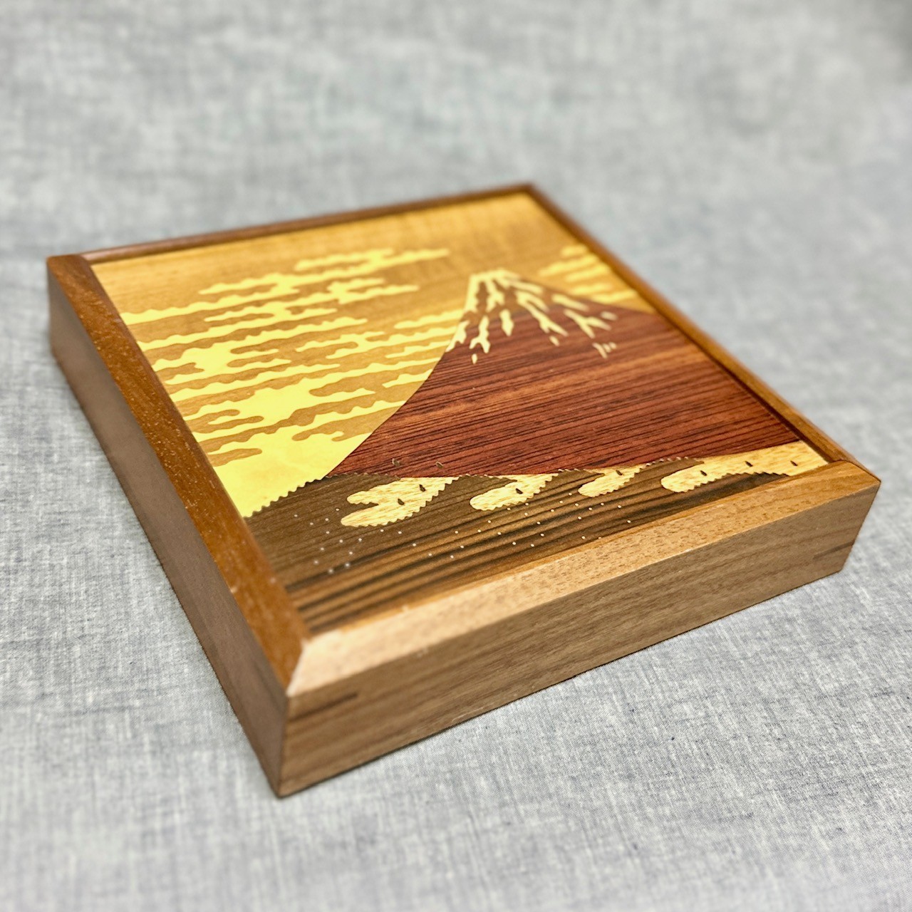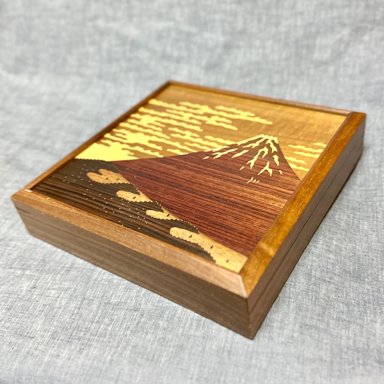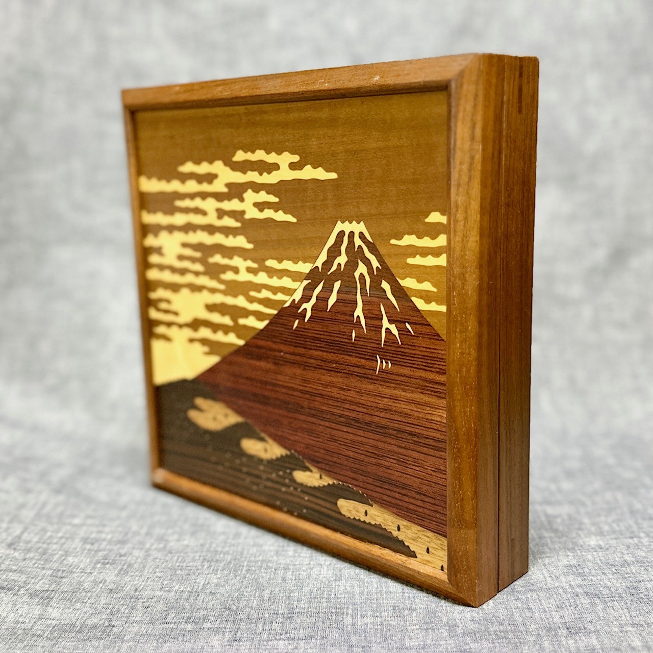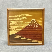 This is a panel box featuring famous Mt. Fuji, designed with beautiful wood inlay art.