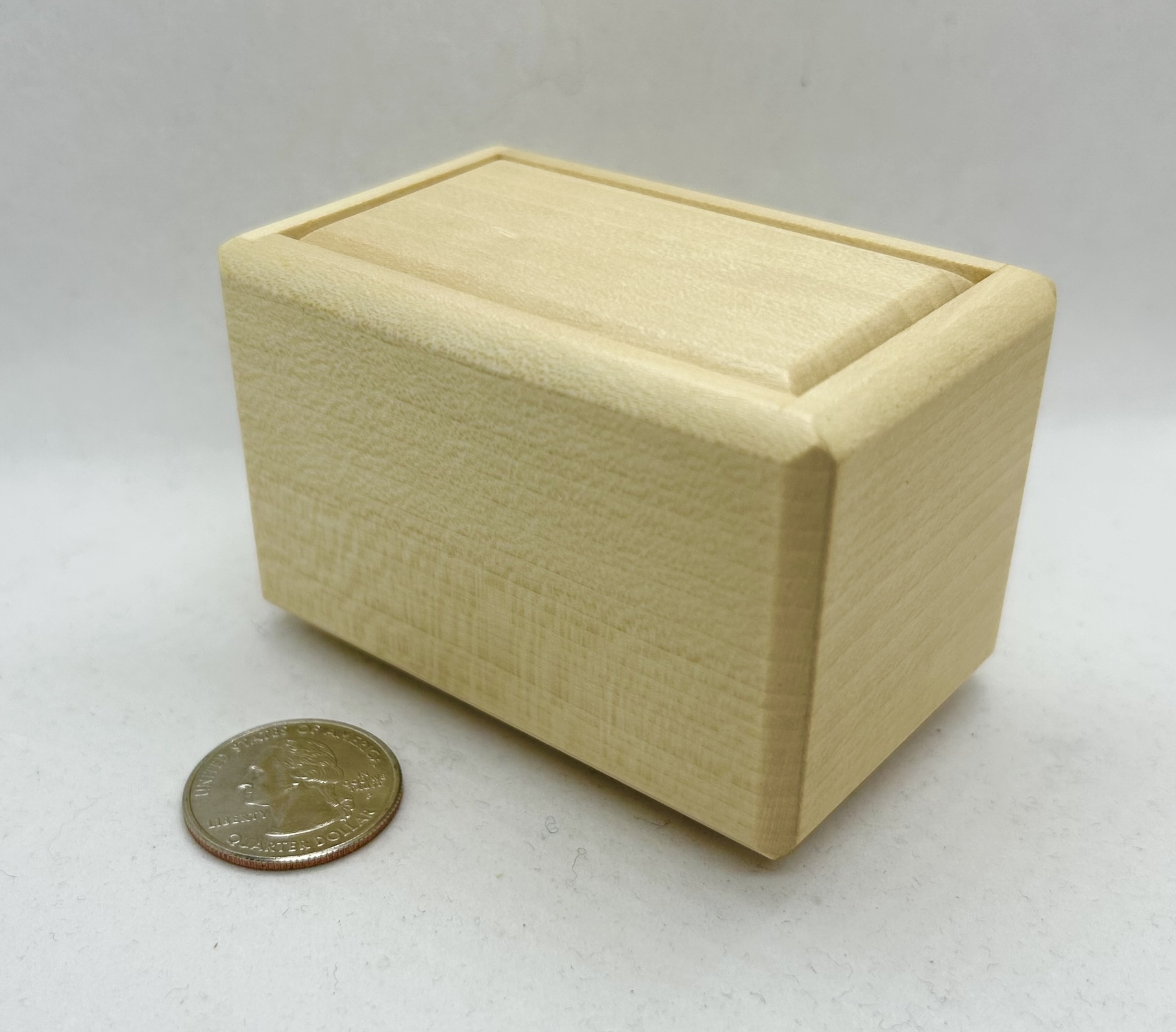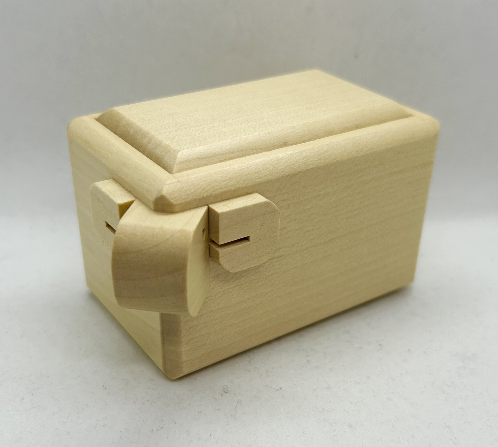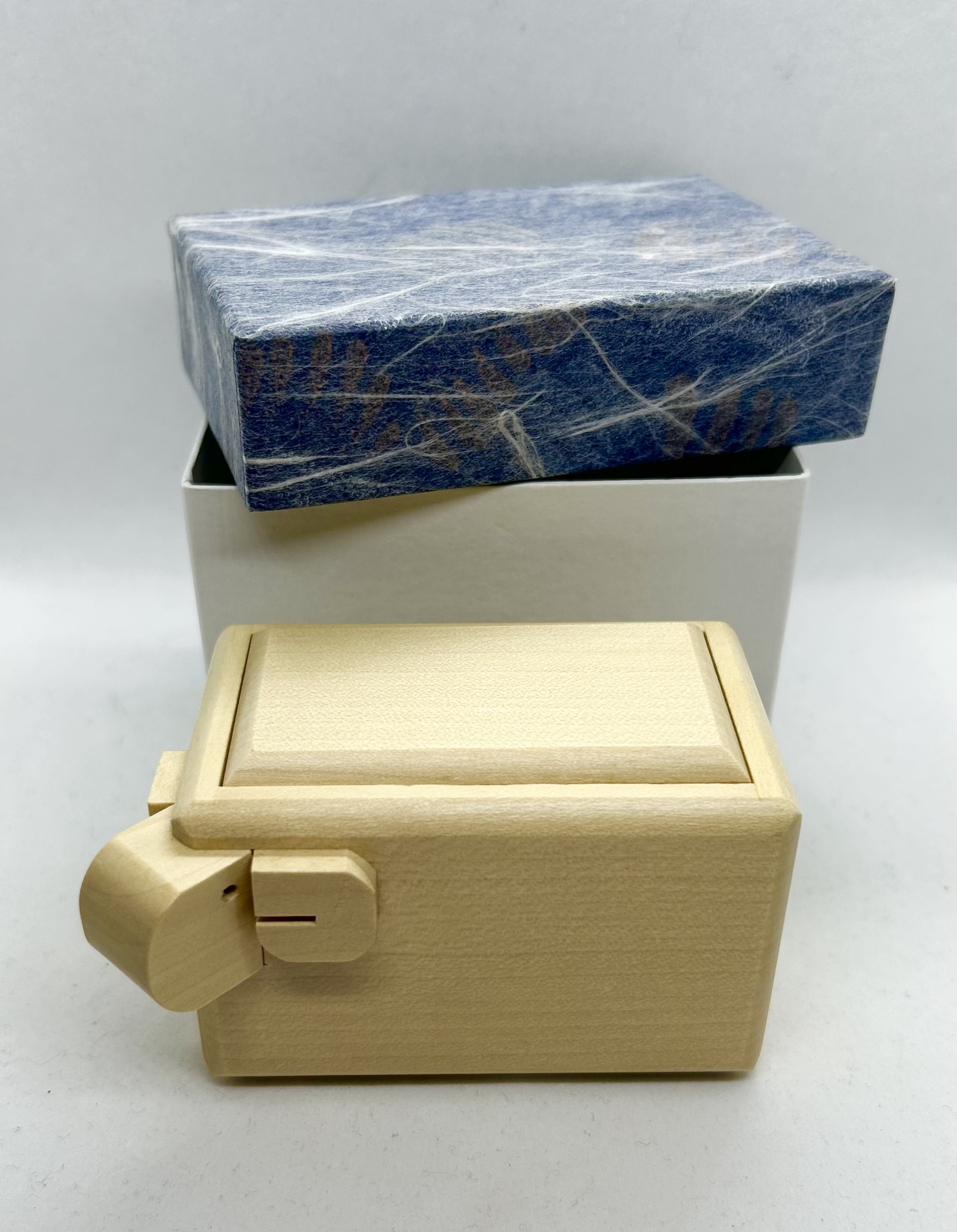 Shiro Tajima is celebrated as one of the most inventive and distinctive early Karakuri Creation Group artisans. His designs often draw from Japanese heritage, with puzzles that revel in tight tolerances and elegant motion. Sheep, his 2014 Karakuri Christmas puzzle, is from his series inspired by animals from the signs of the zodiac. The highly stylized, abstract form of the sheep reflects Tajima’s minimalist conceptual aesthetic, and the solution (to its multiple compartments) is elegant, precise, and highly rewarding. It’s a tactile puzzling treat. Comes with original packaging.