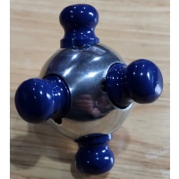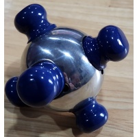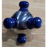 The Six Key Mine puzzle was designed by the late Robert Rose who sadly passed away several years ago. This puzzle won 1st prize in the 2003 IPP Puzzle Design Competition.  It is one of the more unusual looking all-metal puzzles in the sense that it is neither squarish, rectangular, cylindrical nor just a sphere per se (like the Isis).  Rather the puzzle consists of a polished aluminium hollowed-out sphere or ball with six aluminium pegs inserted into its sides, which gives it an almost alien UFO kind of look. The original version by Robert Rose was also made entirely of aluminium except that the pegs there were anodized red instead of powder coated blue, as it is in my version which was made by Bits & Pieces.  Bits & Pieces also re-named the puzzle "Einstein"; as to why this is so I can't figure out. My puzzle is well made and of good quality. The pegs fit properly into their respective holes and can even be adjusted with a small screwdriver to either have a very snug or slightly looser fit.