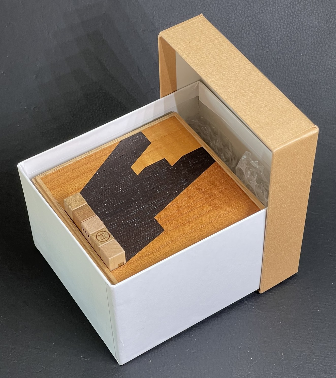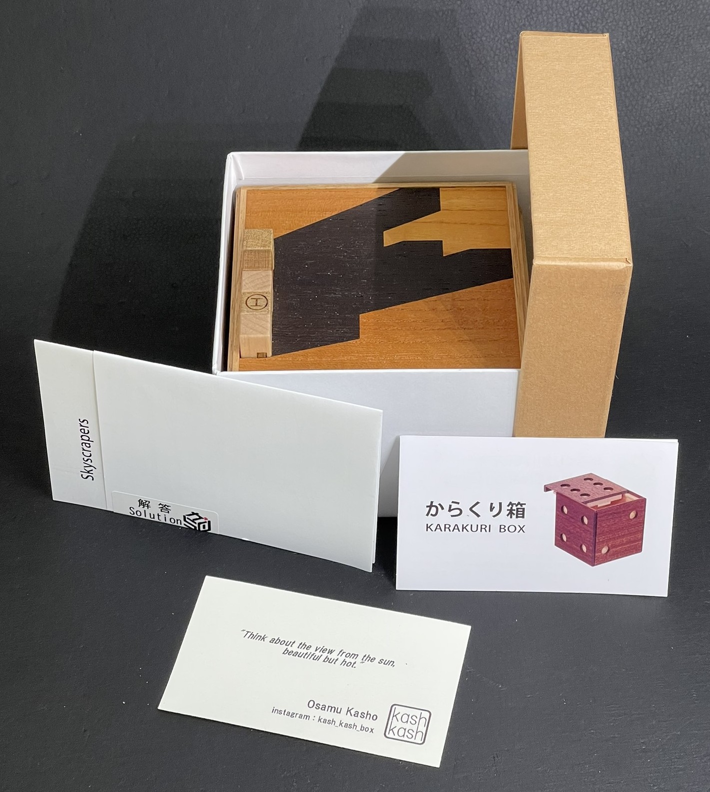 Per the Karakuri website:BOX WITH A RIBBON ⅢcraftsmanAkio KameiITEMP-51Created11/2015Size(box body)80×80×52mmSize(storage part)*****Materialcherry, walnut, purple heartFacebookTwitter共有This box was developed for the Christmas present for Karakuri Members 2015.The puzzle is located in the United States, but I will ship worldwide.Customs forms for international shipments will reflect actual payments.Payments can be made through PayPal (Friends & Family preferred).Buyer to pay shipping ca...