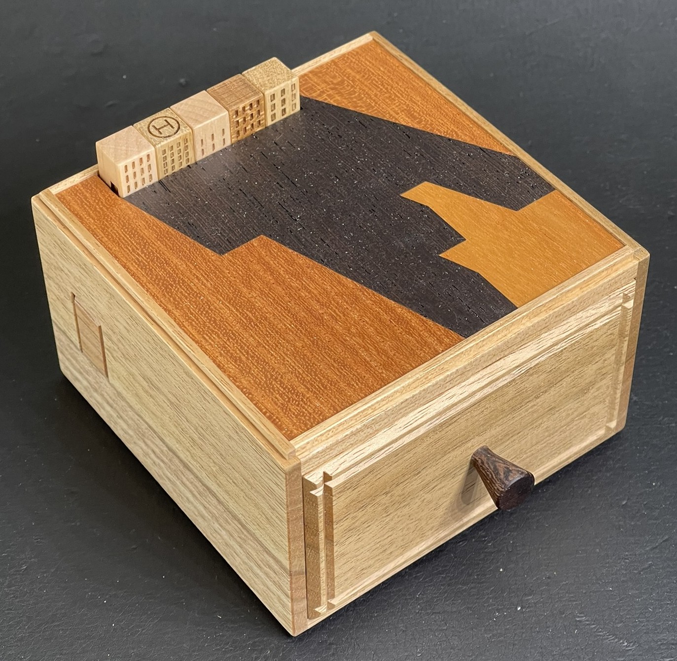 This work was designed for an exhibition with the theme, “GO”. Five buildings are standing on the top of the box. The height of the buildings are adjustable. What is the pattern of the top board? It must be hard to open the drawer without having some viewing point. What if you were the fixed star?