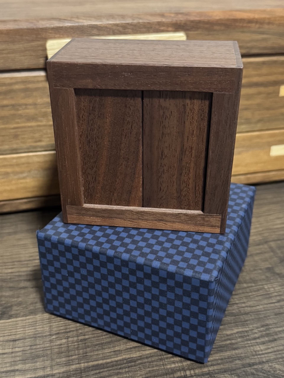 The Sliding Panels puzzle box is an exclusive 2022 Karakuri Christmas gift crafted by Akio Kamei. It's handmade construction consists primarily of walnut. Akio explains this box has a rather untraditional mechanism, having a "slightly different way of unlocking." It also comes with the original box and plastic wrapping.