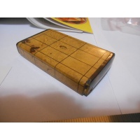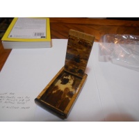 Snuff Box puzzle. Inlay missing on one side. End plate is chipped and broken on one end. Puzzle is barely functional and required excessive force to move end plate. I've managed to open it a couple of times, but I wouldn't recommend it. Estimate about 100+ yrs old. There are some letters scratched into the inside cover, looks like "298 rojo", best I can make out.