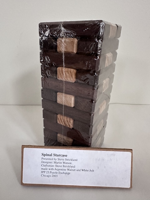 Designed by prolific puzzle designer Martin Watson and manufactured by Puzzlecraft owner Steve Strickland, this was Steve's exchange puzzle at IPP23 in Chicago in 2003. The puzzle consists of 6 pieces which must be placed into the "spine" so as to form the interlocking column. The two sharply contrasting woods make for a beautiful finished product.