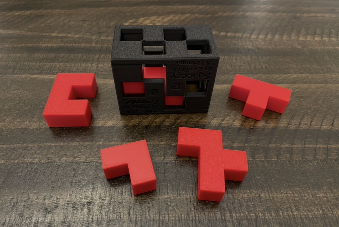 Goal: Pack all the pieces into the movable 2 piece cage. Very Tricky!