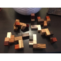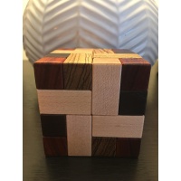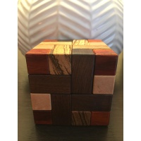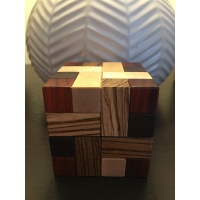 This is the second and less well known of Coffins cube trilogy. Finely crafted from solid Zebrano, Walnut,  Maple, Padauk, and hidden inside is Sapele. Lacquered and waxed. This puzzle is a gorgeous piece of art and will occupy a place of pride in any collection. Ships assembled. Measures 2.5” each side.