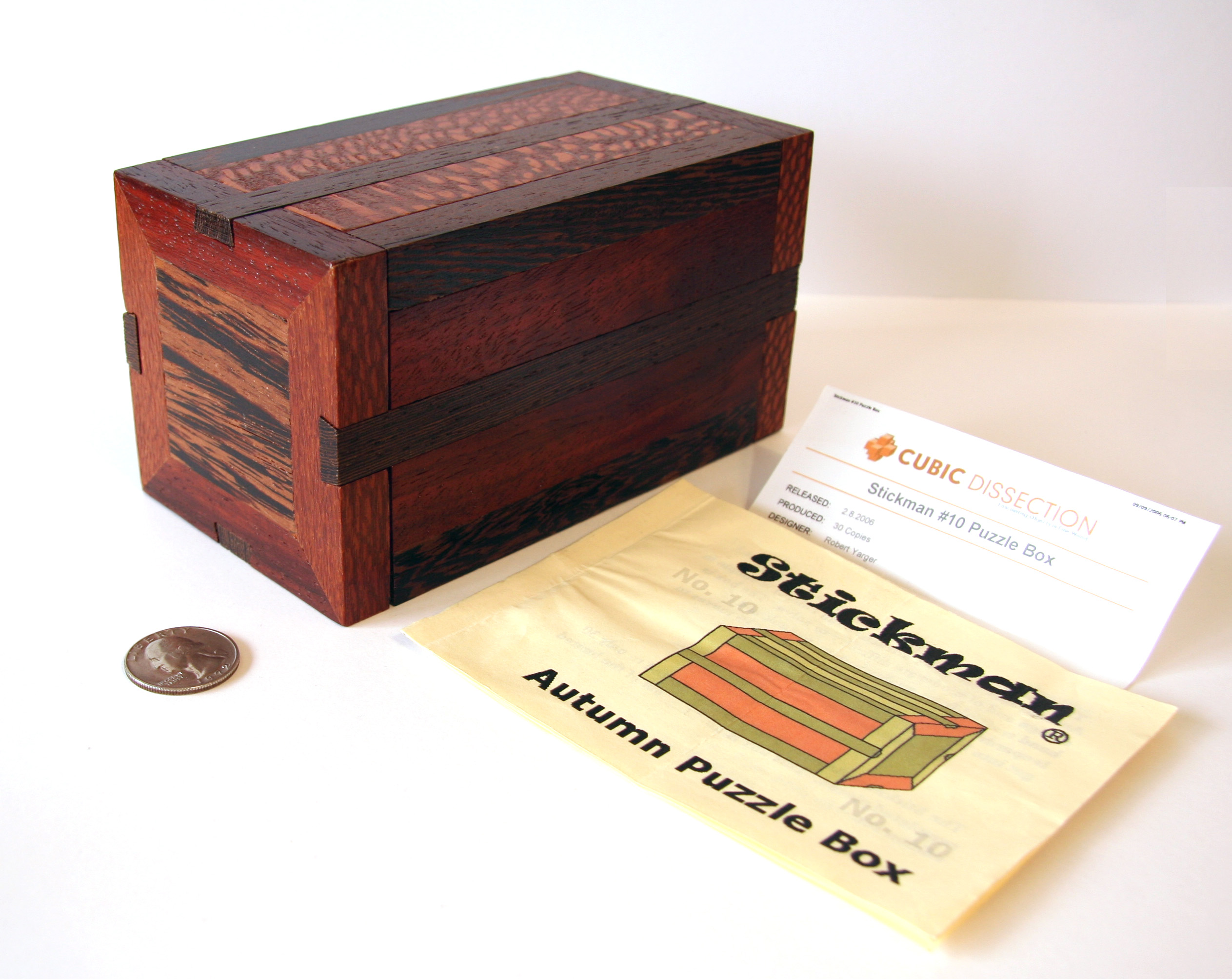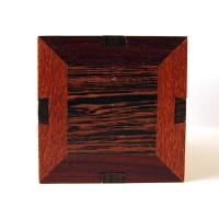 The Autumn Puzzle Box is No. 10 in the line of unique Stickman puzzle boxes and derives its name from its collage of attractive fall colors. It is handcrafted from quality wenge, padauk, and leopardwood pieces. The Autumn Box is of moderate difficulty to solve and requires a bare minimum of 15 moves to get into both of its hidden compartments.