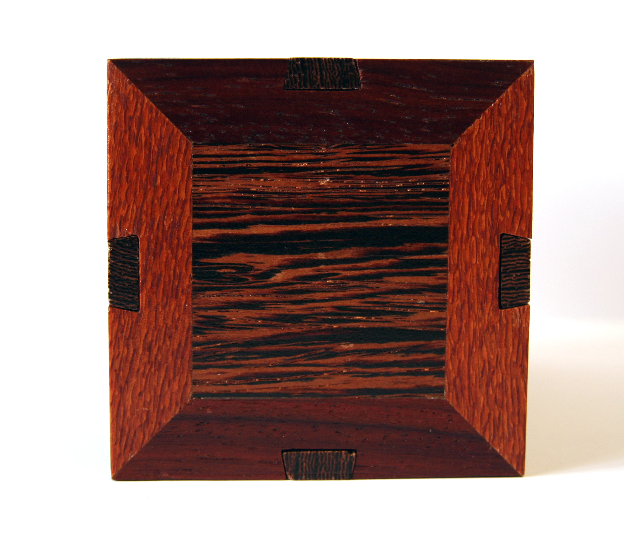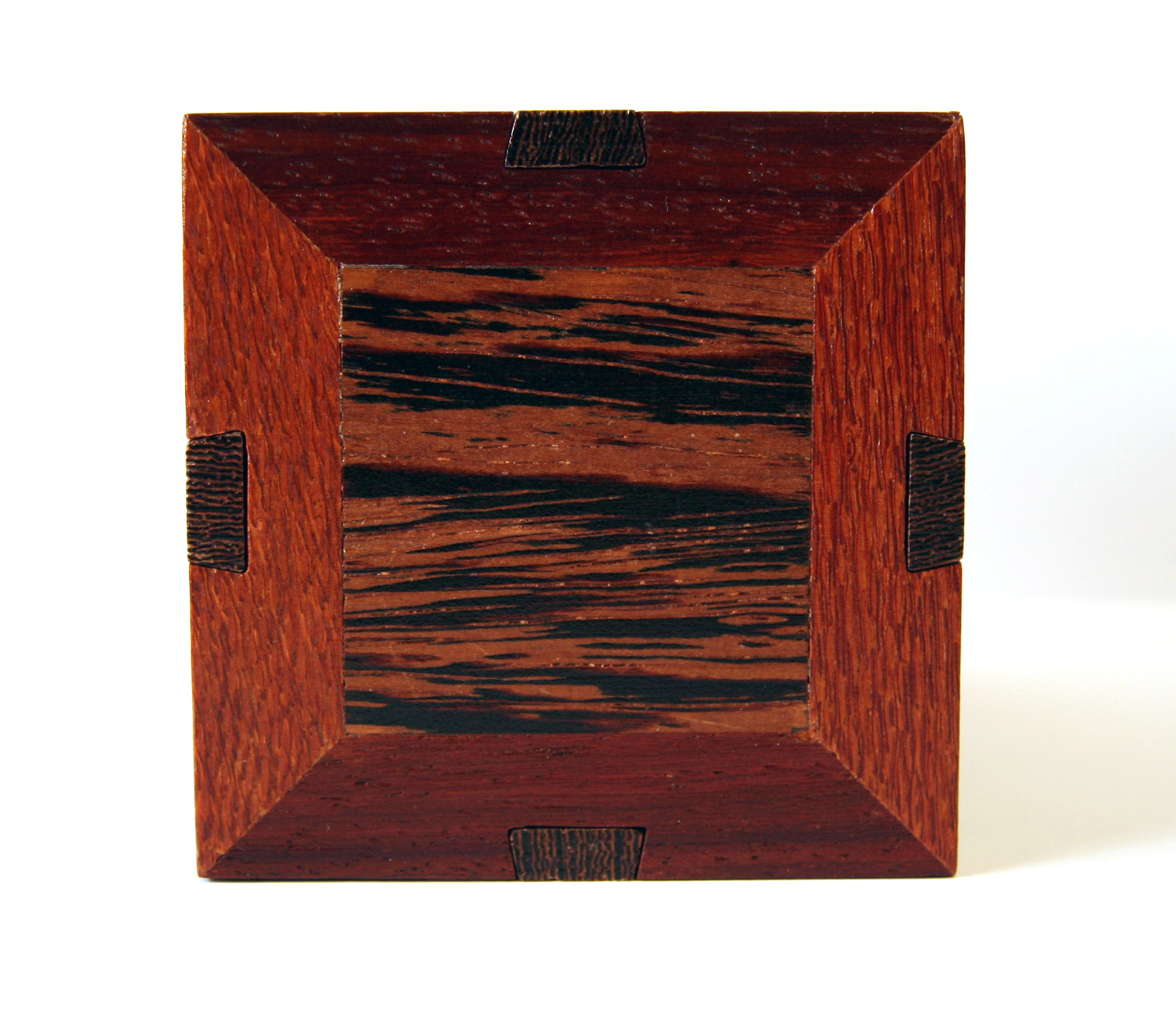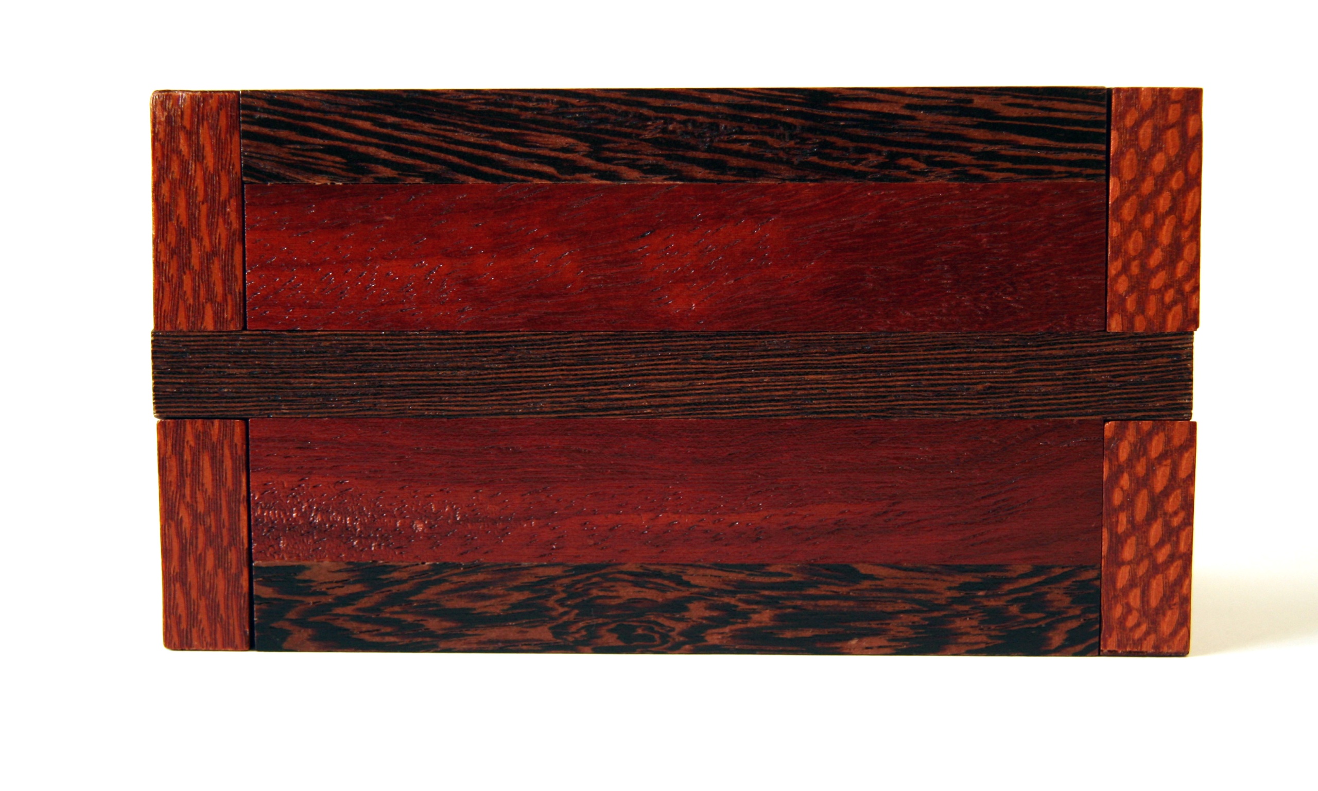 The Stickman No. 10 Puzzlebox is also called the “Autumn Box” due to its application of Fall colors. This was Robert’s first experience with using padauk, and he did not realize that he would also be arrayed in decorative Autumn colors, as this wood’s sawdust tends to permanently dye almost anything it lands on its own unique shade of orange. The thin layer of dust it left all over the wood shop was quite bizarre to behold. The decorative dovetail locking bars of this box can freely slide in either direction, but not totally off. The logical assumption would be that freeing one end or the other would somehow allow something else to happen, but it doesn’t. Opening this puzzle requires the discovery of a very elusive trick. Once discovered, its two secret chambers become easy to access after only 15 moves. Locking both sides back up again requires implementing this trick half way.