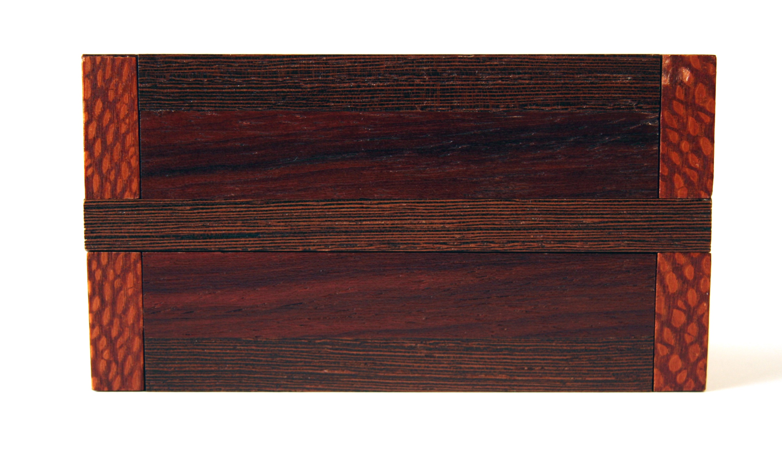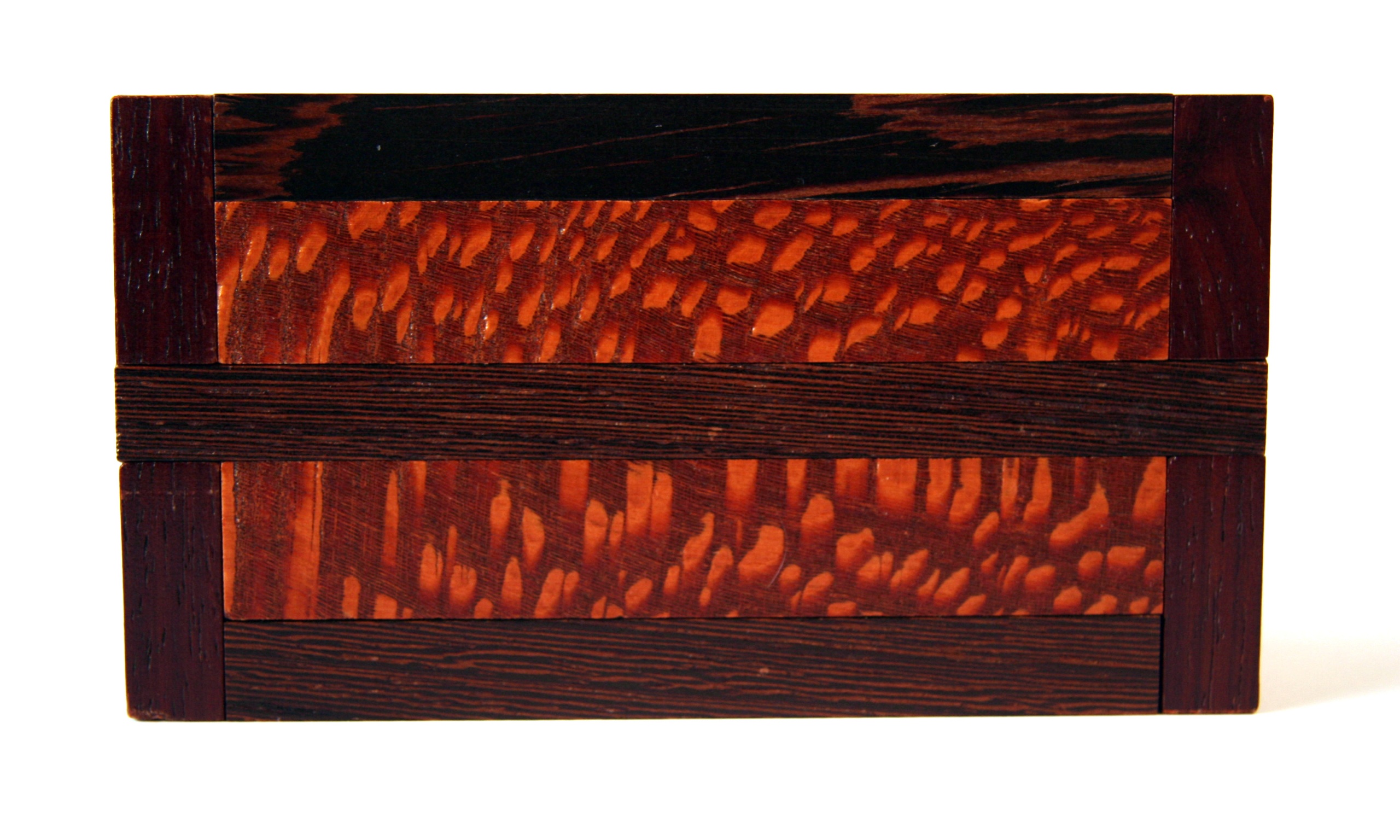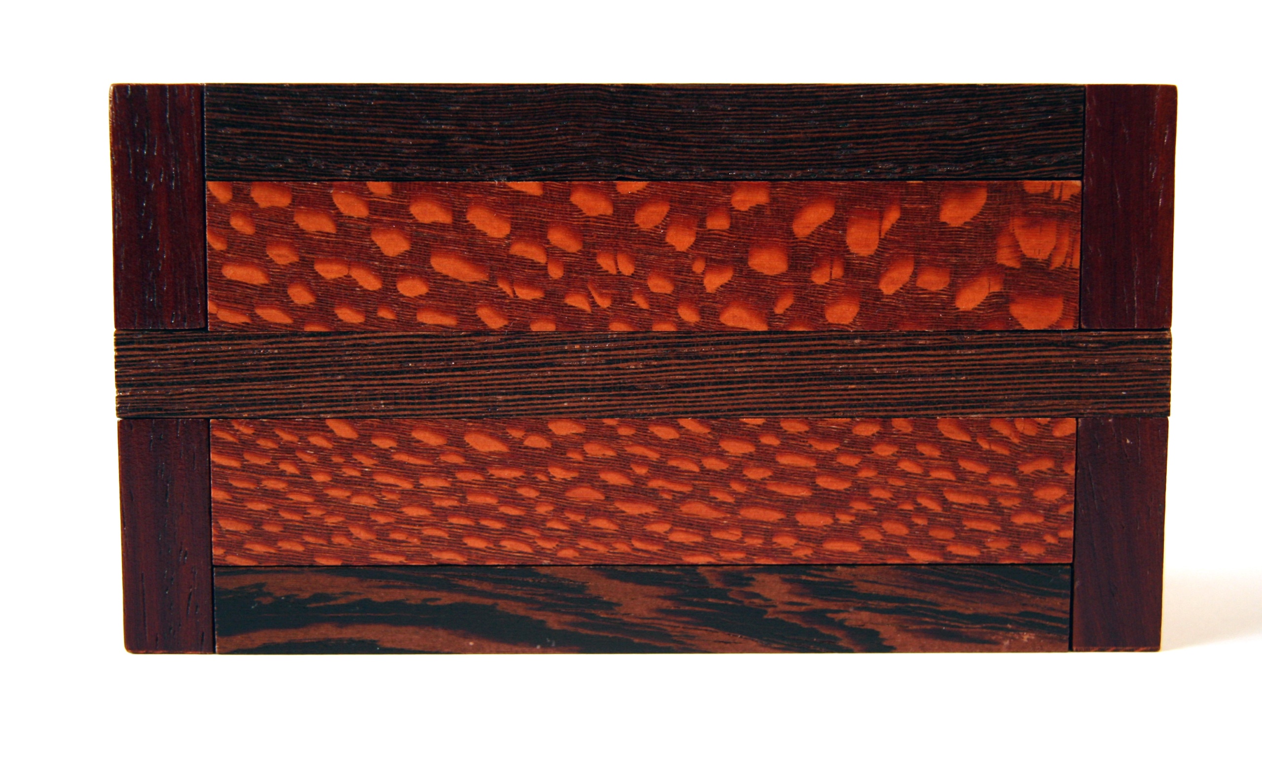 The Stickman No. 10 Puzzlebox is also called the “Autumn Box” due to its application of Fall colors. This was Robert’s first experience with using padauk, and he did not realize that he would also be arrayed in decorative Autumn colors, as this wood’s sawdust tends to permanently dye almost anything it lands on its own unique shade of orange. The thin layer of dust it left all over the wood shop was quite bizarre to behold. The decorative dovetail locking bars of this box can freely slide in either direction, but not totally off. The logical assumption would be that freeing one end or the other would somehow allow something else to happen, but it doesn’t. Opening this puzzle requires the discovery of a very elusive trick. Once discovered, its two secret chambers become easy to access after only 15 moves. Locking both sides back up again requires implementing this trick half way.