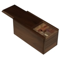 This puzzle is based on a concept by Asher Simon, and is Robert's tribute to the genera of packing puzzles. It is called the “One Hand Puzzlebox” because using a single hand is the most satisfying way of solving it. Remove the packing puzzle pieces from one end of the box, and they flip around like a transformer robot. Pieces have to be separated and placed back into the compartment, one at a time, and in a particular order, just to get them back in. At times, combined pieces have to slide around with a satisfying “snap into place feel” to fit the others in. Upon proper completion, the second compartment will open. This also resets the puzzle pieces to transform once again the next time they are removed.