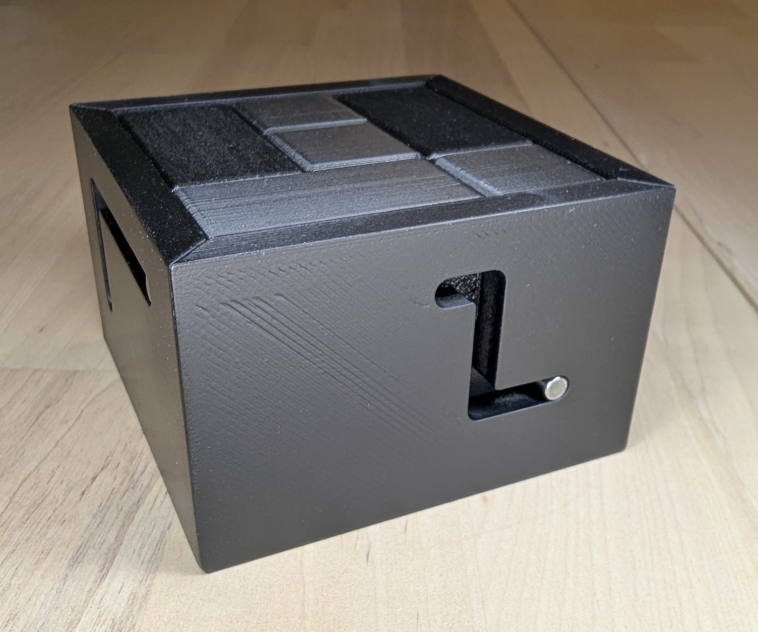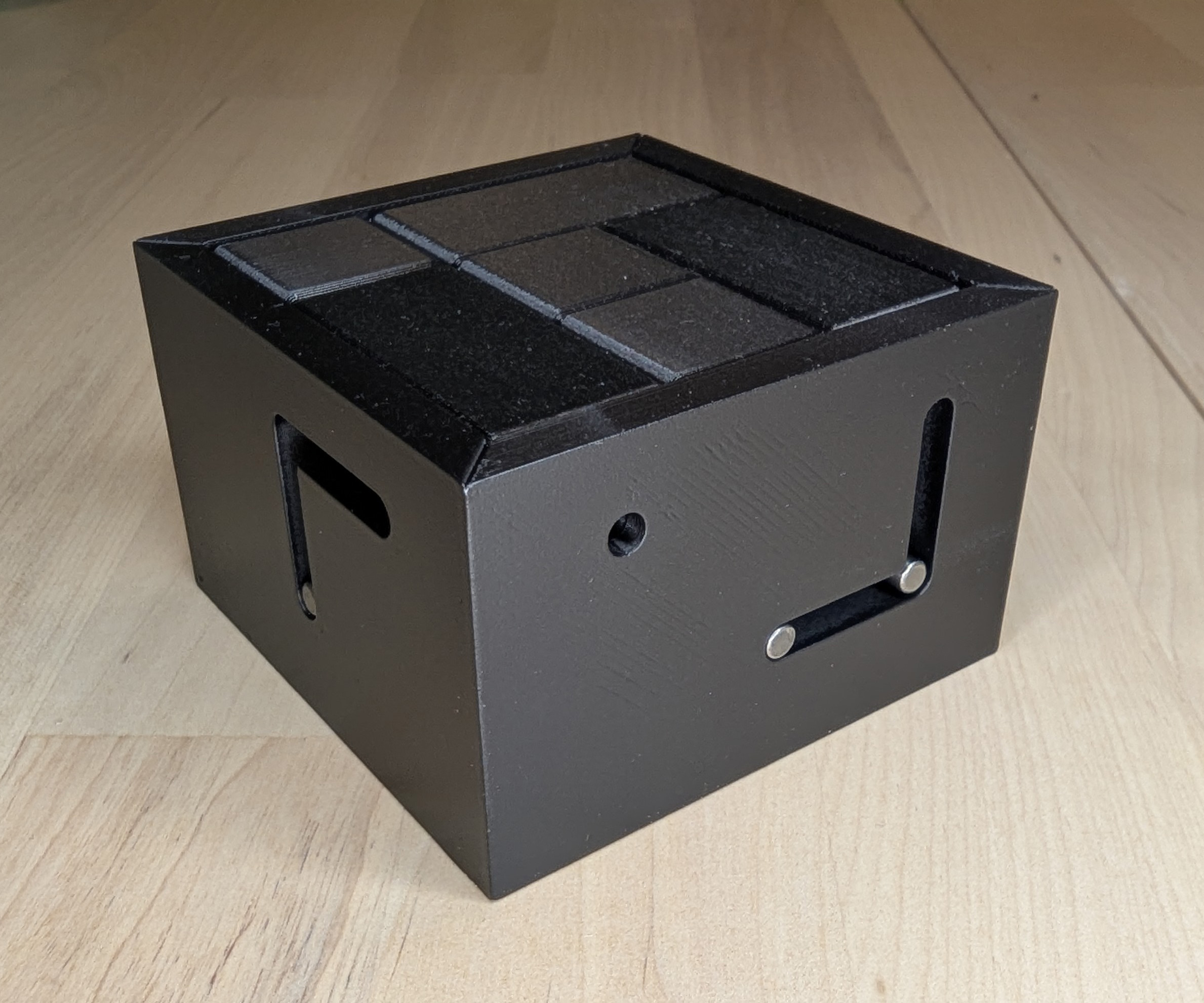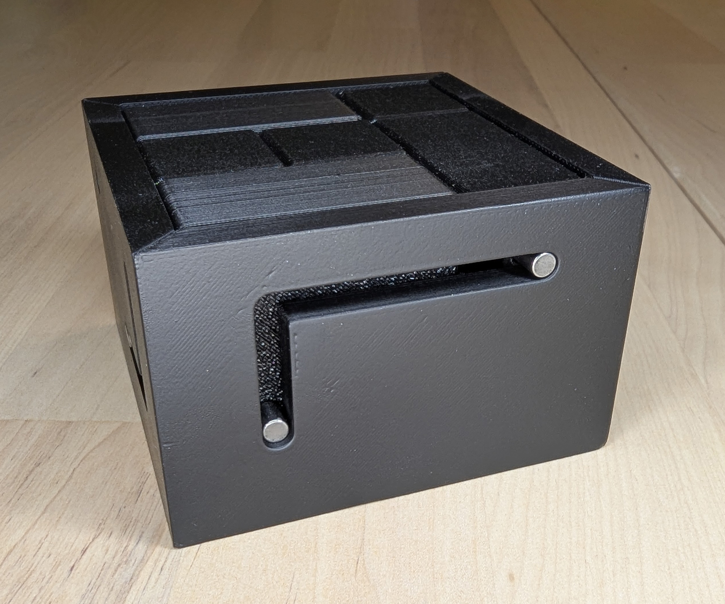 This is a 3D Printed Copy; in my first attempt, I printed the box in one piece but the tracks on the side walls used supports, and I didn't like them. So I divided the box into 5 parts. The first print of this version, made on a smooth plate, had uneven side walls, so I decided to paint them with a black acrylic spray paint. I gave it 5 coats of paint to get a good finish. Then I also made the interior pieces with black PETG, and this Dark version was born.