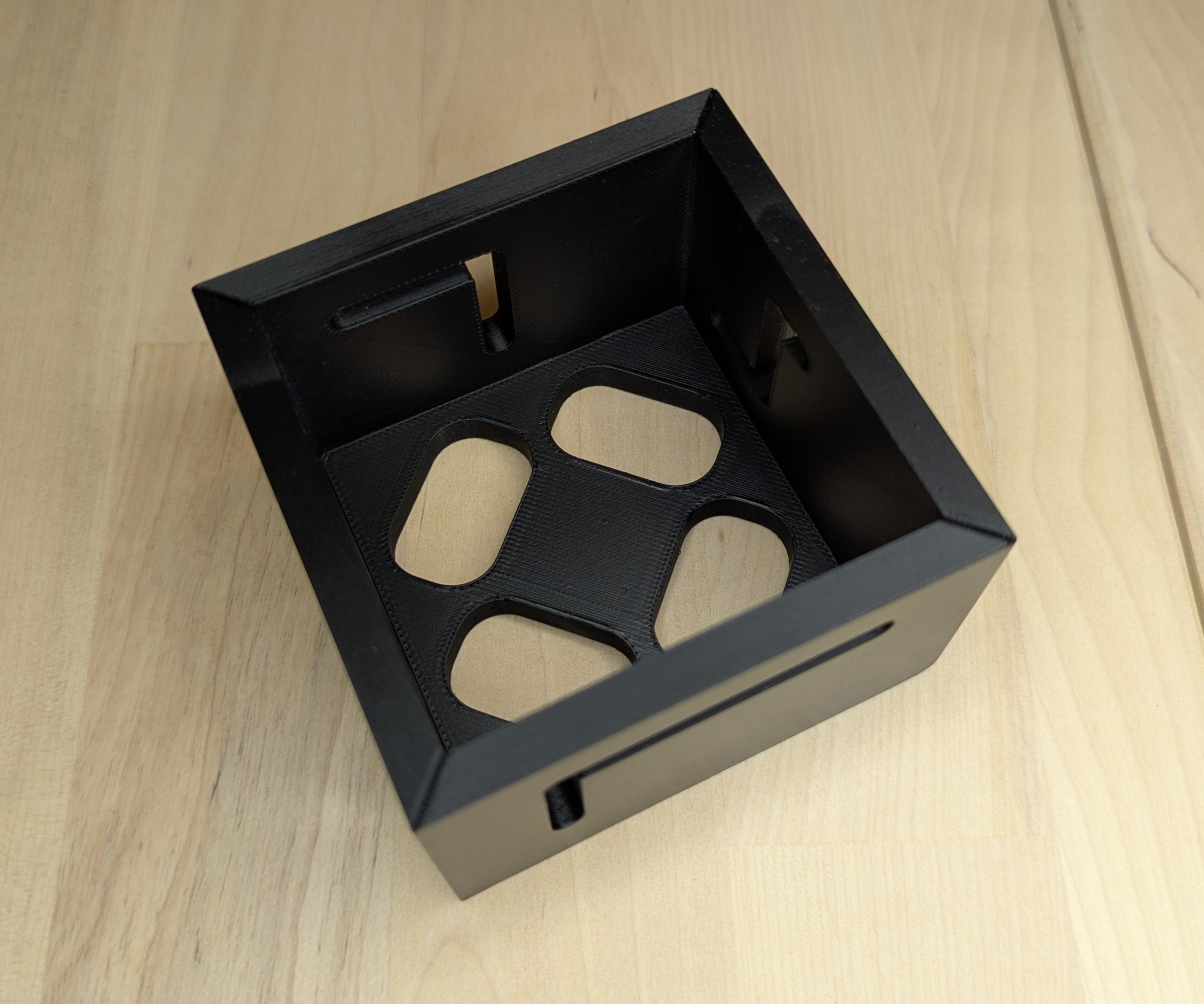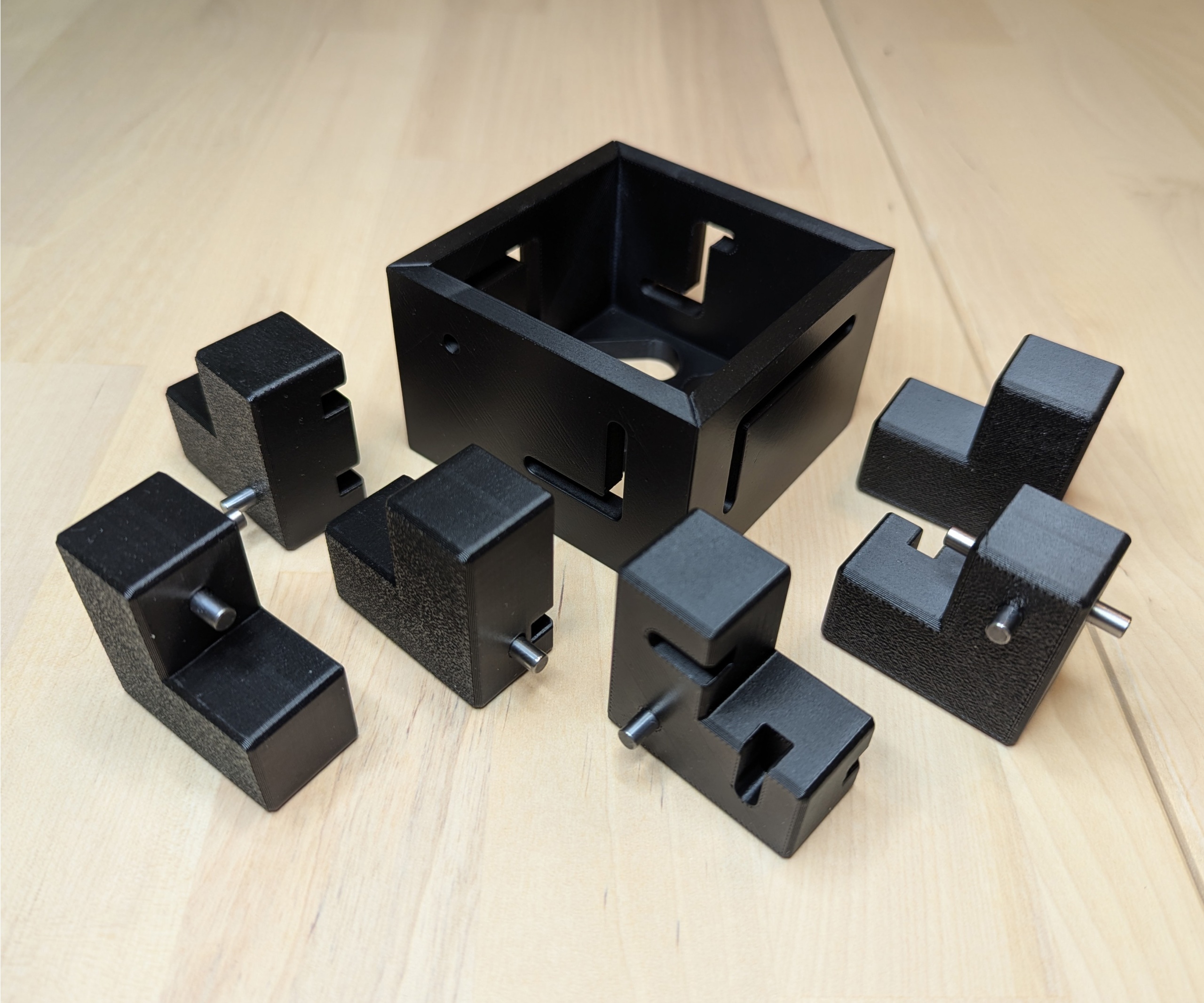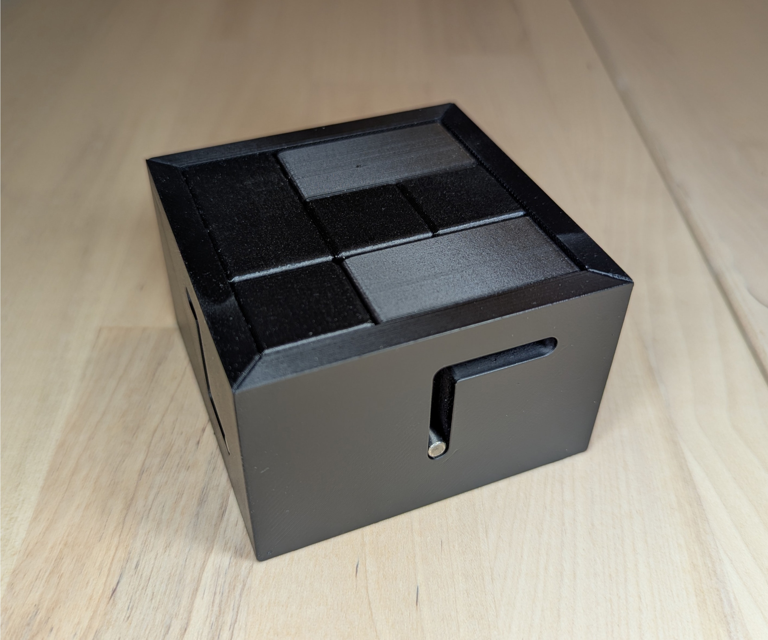 This is a 3D Printed Copy; in my first attempt, I printed the box in one piece but the tracks on the side walls used supports, and I didn't like them. So I divided the box into 5 parts. The first print of this version, made on a smooth plate, had uneven side walls, so I decided to paint them with a black acrylic spray paint. I gave it 5 coats of paint to get a good finish. Then I also made the interior pieces with black PETG, and this Dark version was born.