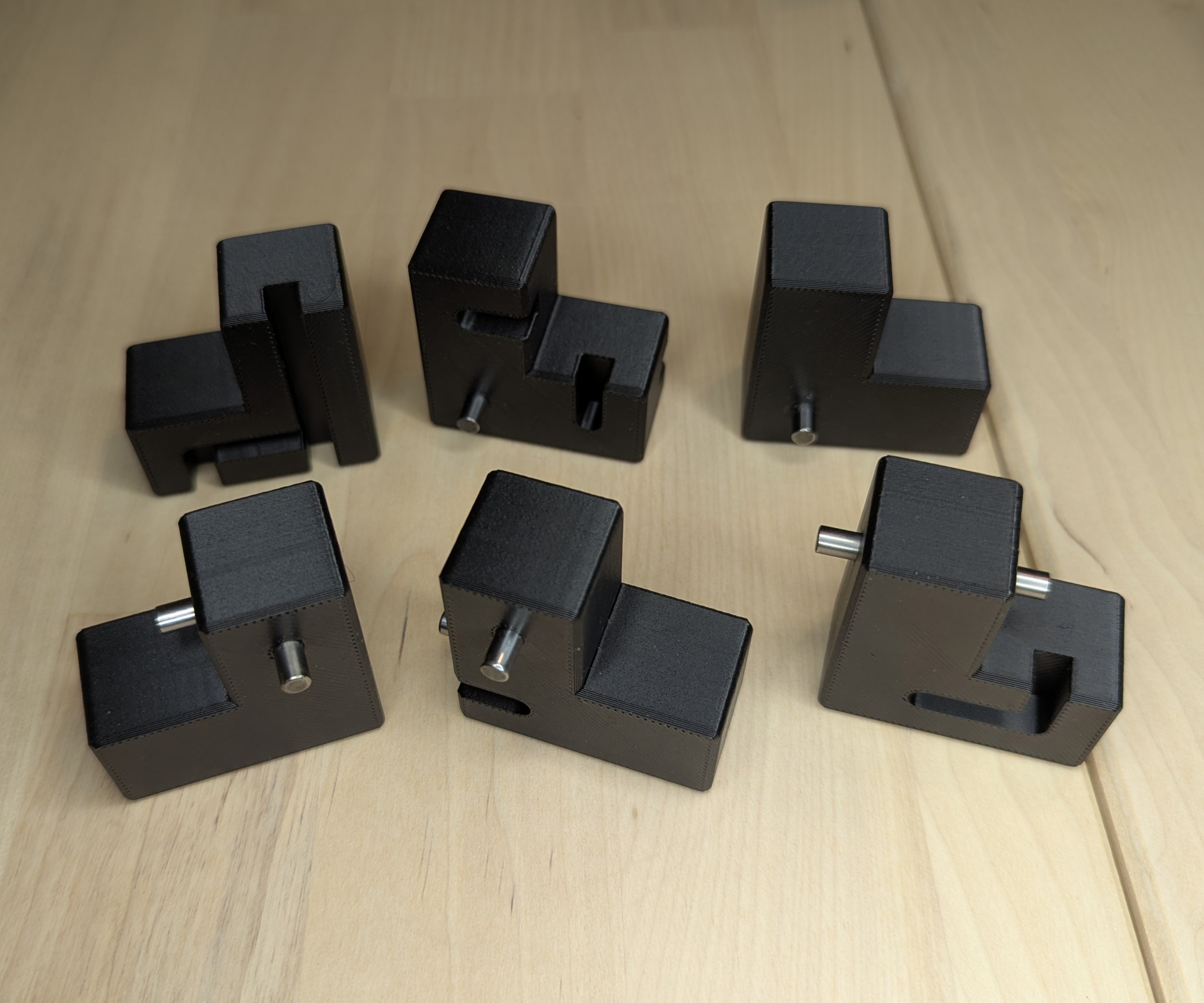 Strugg-L is a curious variation on the usual packing puzzles. First of all, it's not a full 3x3x3 cube, but a 3x3x2 parallelepiped. Another peculiarity is that the pieces and the container have "tracks" on which some pins on the pieces fit and slide. So, your movements are limited by pins and tracks, and figuring out the right moves to assemble it won't be easy.
