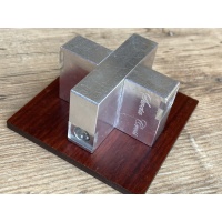 The goal is to take apart and reassemble the parts of the cross. This puzzle has four transparent "windows" which allow you to see very small ball bearings that are a part of its inner mechanism. It is designed to be less difficult than the First Cross puzzle. A wooden display stand (plate) is also included.