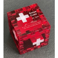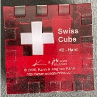 The Swiss Cube series of puzzles was designed by Jürg von Känel. In all cases the puzzle is to remove the white Swiss cross pieces and then put them back in.