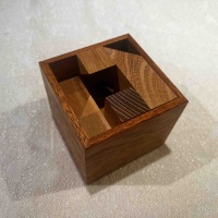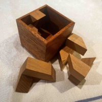 Tau is a sort of reaction or "remix" of No Holes Barred by Laszlo Molnar. It was crafted by Pelikan and designed by Volker Latussek. Here the pieces feature half voxel parts which leads to quite a more complex and beautiful solve than the original. This was delightful to solve and the quality of the woods is amazing. The goal is to pack in all the pieces so nothing sticks out and the top surface must be completely filled.