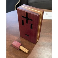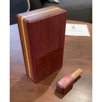 This is the Templar Lock puzzle from Tyler Williams. This is a super fun puzzle with a very satisfying solution, plus it's so beautifully made! This is one of the first puzzles I ever bought (I bought it a little over a year ago) and as a result it has been solved and reset quite a few times. The puzzle functions beautifully and is in great shape, but there are some small signs of wear from solving and resetting it so much. In particular, the notch on the upper left side of the puzzle (seen in the second image) is a little marked up from my solving attempts.