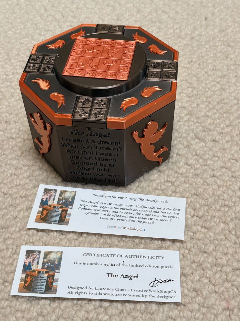 The puzzle has been solved and reset a few times by me.It is in great condition.Buyer pays shipping. Please wait to make final payment until shipping costs have been added. Shipping from California, USA.  I prefer to ship inside the US (not as familiar with international shipping).Paypal (FF) or Venmo (preferred).Original description:Burner resembles a modern cell phone and should provide a bit of a challenge. The goal is to remove the center portion. Once solved, the inner mechanism...
