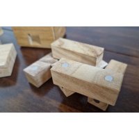 The goal of AGB+ is to pack six bars into the box using only the two cutouts in the front and side of the box. However, there are rules: the box must be kept on a flat surface while solving. You may not move a piece with anything other than another piece. The pieces are complex, containing embedded magnets in various locations, polarities, and strengths. We include two sets of pieces, the first with two solutions and the second (marked with an inlaid circle) featuring a unique solution.