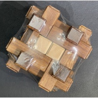 The 5 piece burr at the centre of the puzzle is crafted from Queensland Silver Ash. The frame consists of 24 individual interlocked pieces and was available from Queensland Blackbean or Western Australian Jarrah . Size 100mm x 100mm x 100mm Packaged ASSEMBLED
