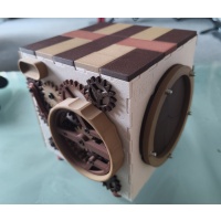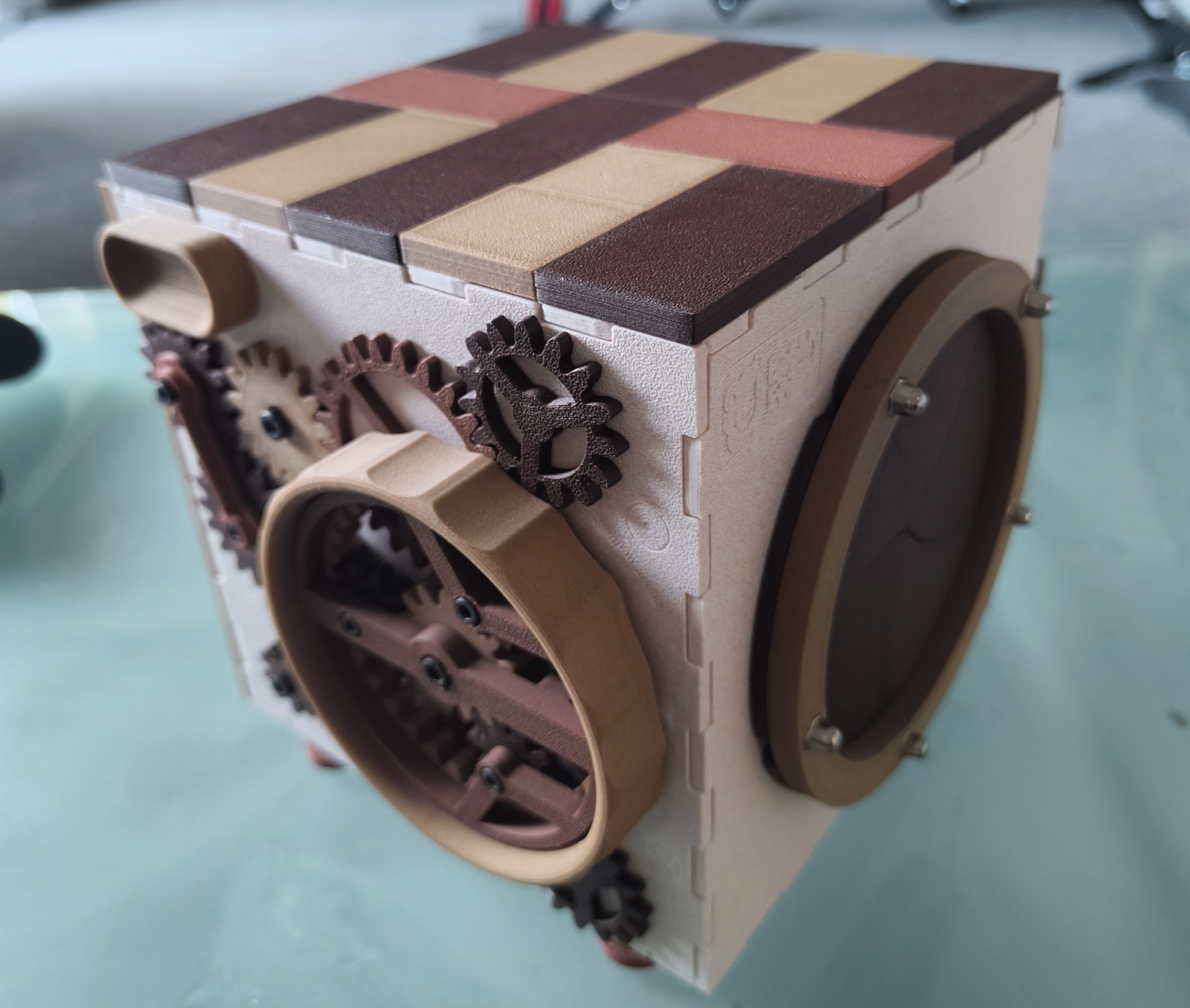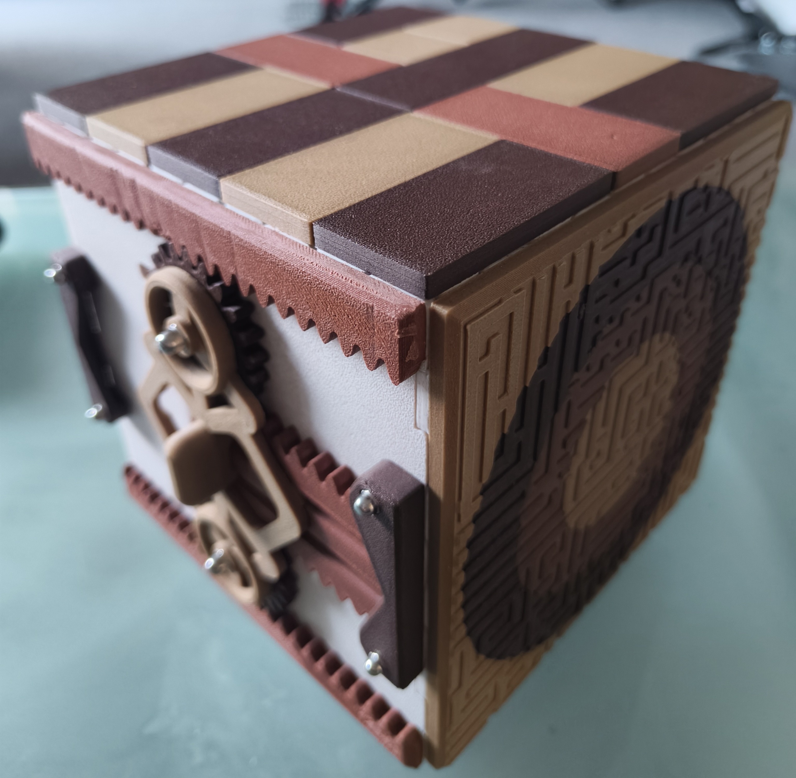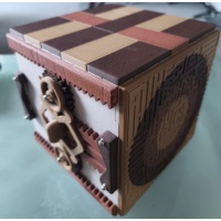 This is a quite a large sequential discovery puzzle box designed by Zeko (Bubbly Evil) , 3D printed,  made from PLA marble and 3 variants of wood infused PLA, other materials are TPU springs and many many hardware parts such as nuts bolts threaded rod, steel pins and washers. There are many mechanisms to this sequential discovery puzzle box. It takes around 4 days to print and weighs over 1KG, the goal is to open the compartment.