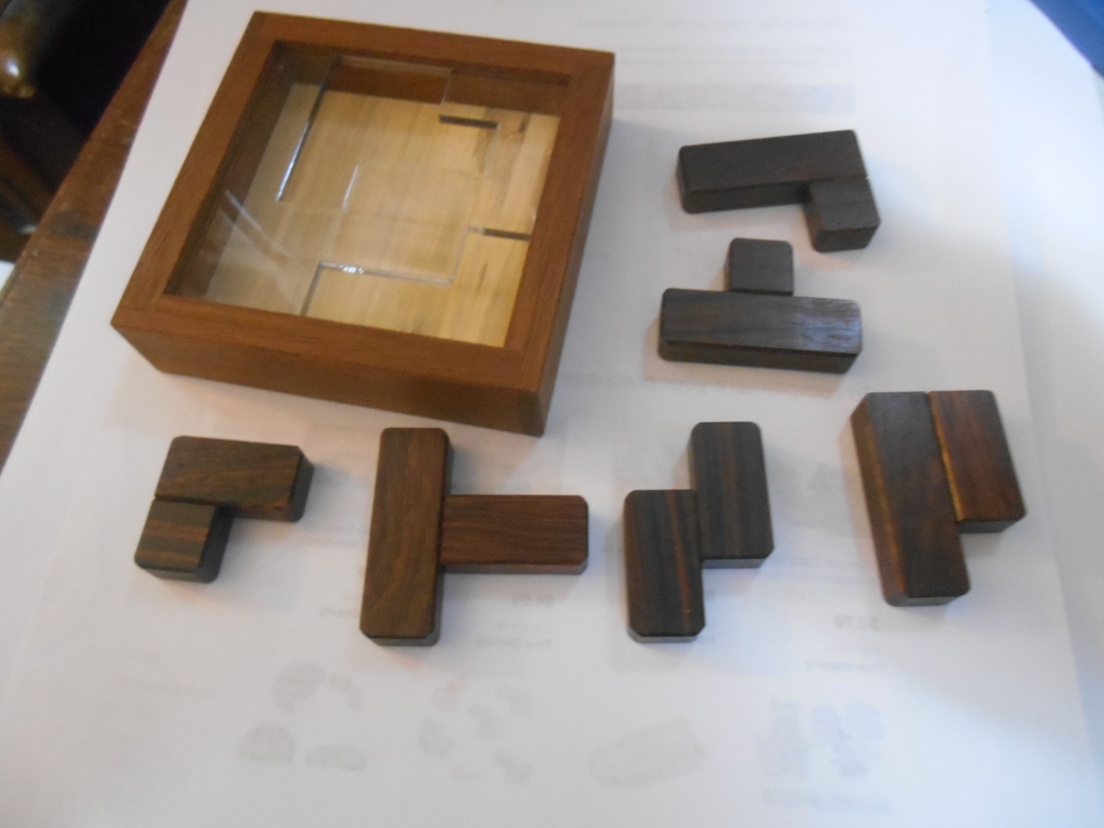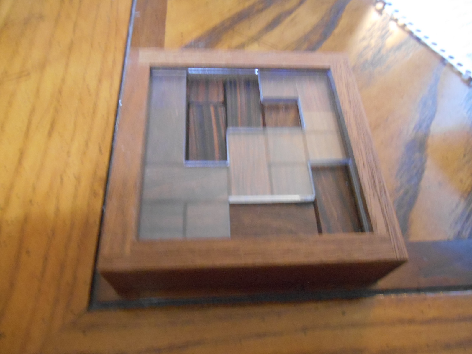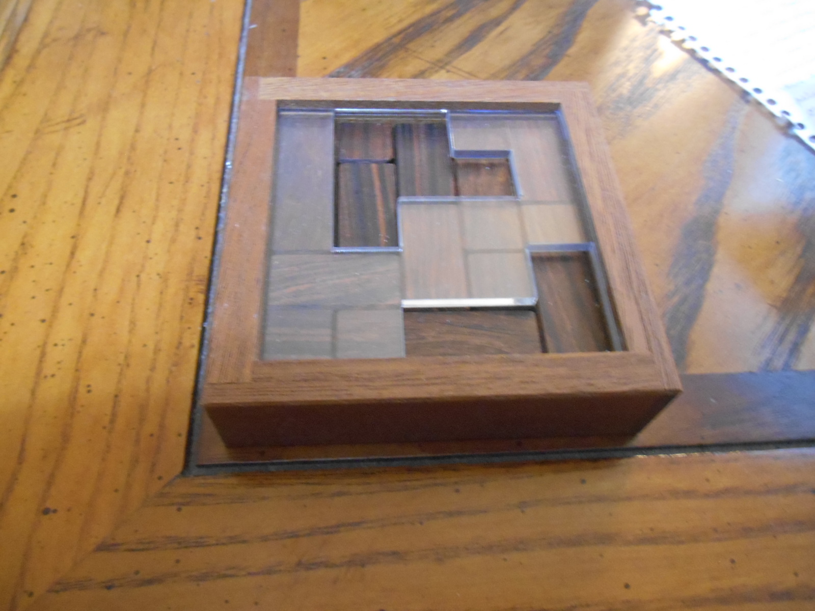 The Decoy - designed by Stuart Coffin, mfg by Eric Fuller (42 copies in 2013).  For a detailed description, visit https://cubicdissection.com/products/the-decoy. Signed by Fuller and dated (see pix).  Made from cocobolo, spalted wormy holly, sapele, and acrylic. This copy is in excellent condition. This can be shipped disassembled at your request; if you take it apart, that would give away the solution (although, it isn’t that easy to take apart, either). Fun little puzzle.