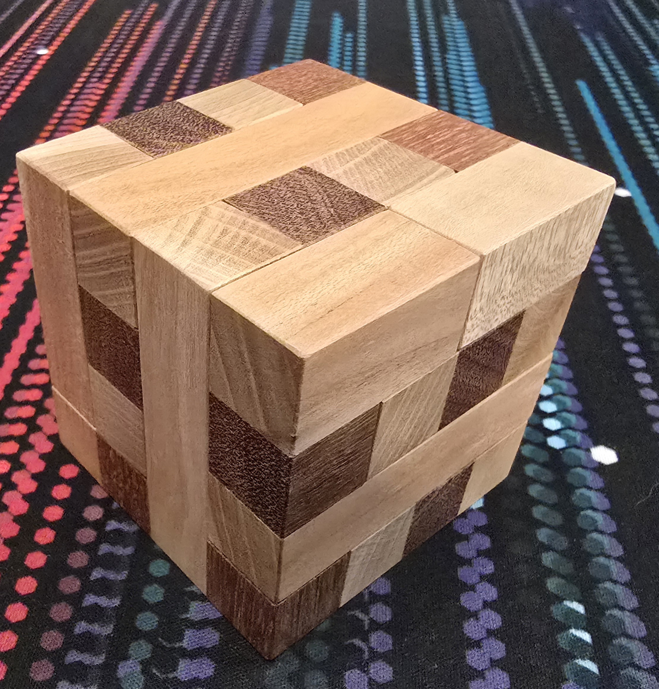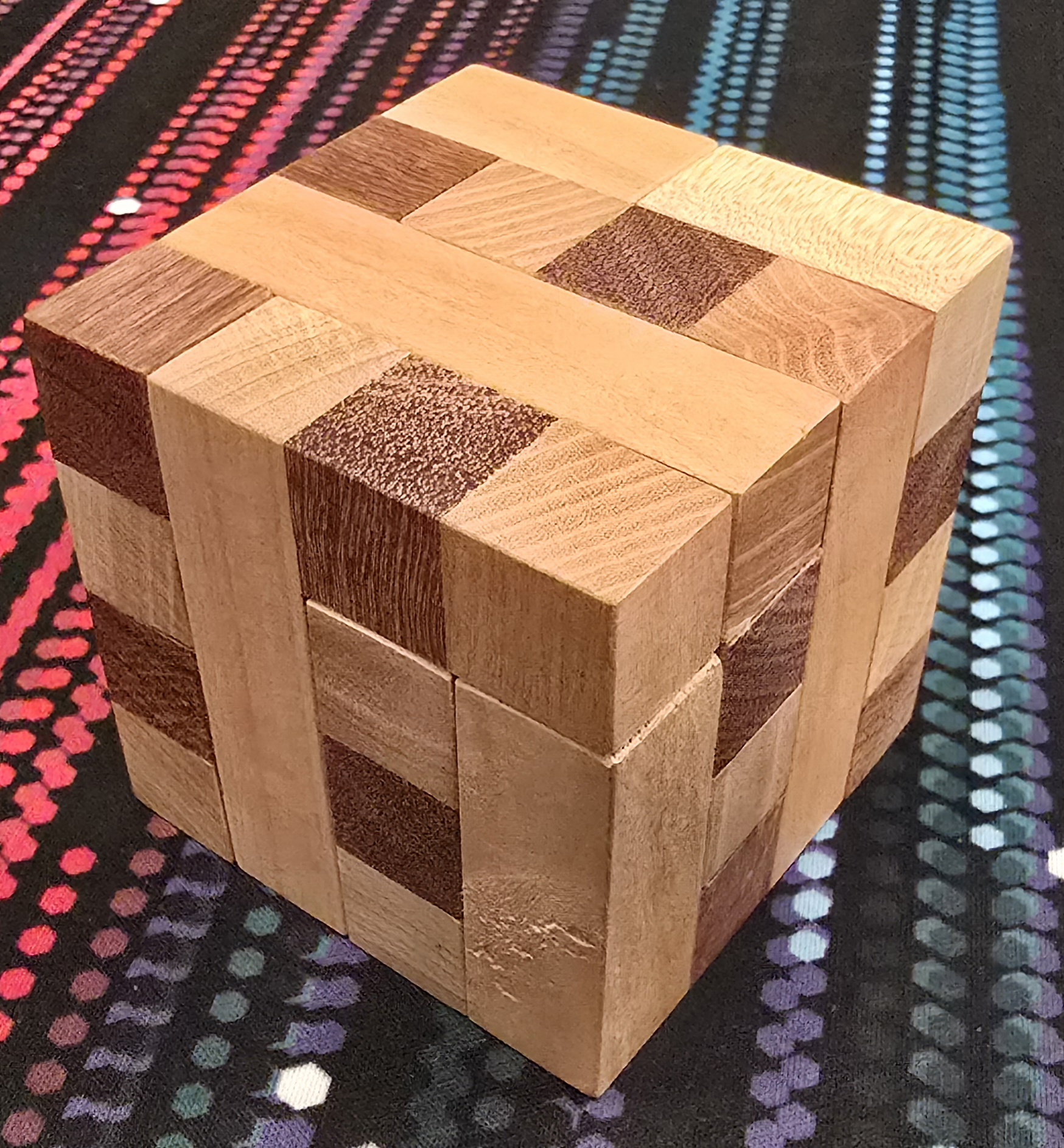 • ​Materials: Built of "fine hardwoods," the puzzle utilizes contrasting species (likely Walnut and Maple) to create a striking 3x3 checkered cube.