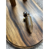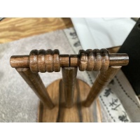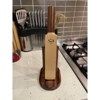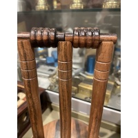 Materials: The blade of the cricket bat is made from Queensland Silver Ash. The traditional wood is willow but this wood is not stable enough to make a puzzle from. The handle is turned out of Tasmanian Blackwood and has an original Sir Donald Bradman 20c coin imbedded in the top of the handle. The Oval, and the Wickets & Bails, are made from Papua New Guinean Ebony.