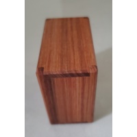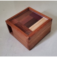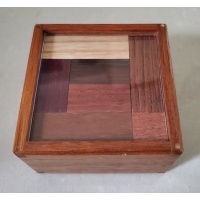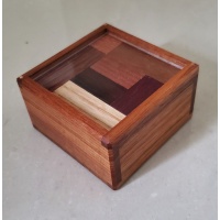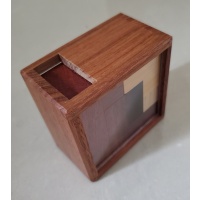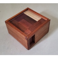 This puzzle was Henry Strout's exchange puzzle at IPP 29 in San Francisco. I enjoyed solving it a lot, and decided to make a run of them. To solve the puzzle, all the pieces must be put in the box. Easy enough, except for two things. One, they must all go through the 1x2 slot in the side, making the order of insertion quite important. Two, the yellowheart piece is stuck inside the box, so you have to plan around that. Quite tricky! Using a toothpick makes assembly easier, but it's solvable without any tools (I've done it, it's just trickier)