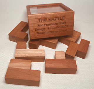 I have decided to offer up this puzzle in an effort to further thin out my personal collection.  This classic Coffin design was Henry’s IPP 24 Exchange puzzle at Tokyo, Japan  in 2004 and marked his second appearance in the exchange.Eric Fuller (RIP) released (2005) a modified version with a wood slotted top to make the puzzle much more difficult!Here’s Stewart’s description:“Try your luck on this one - or test your patience! The seven polyomino-type pieces of Slot Machine are inserted...