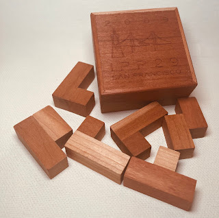 I’m offering up this fun design by Alexander that was beautifully crafted by Pelikan.Kevin Sadler wrote about it:“Do you like the Soma cube and its associated challenges? If so then you will love the Edition of Additions! Alexander has branched out into a different genre of puzzles to his usual packing or interlocking puzzles and has created something perfect for new and old puzzlers alike. This is absolutely stunning made with Bubinga pieces and an Oak box which has been beautifully made (...