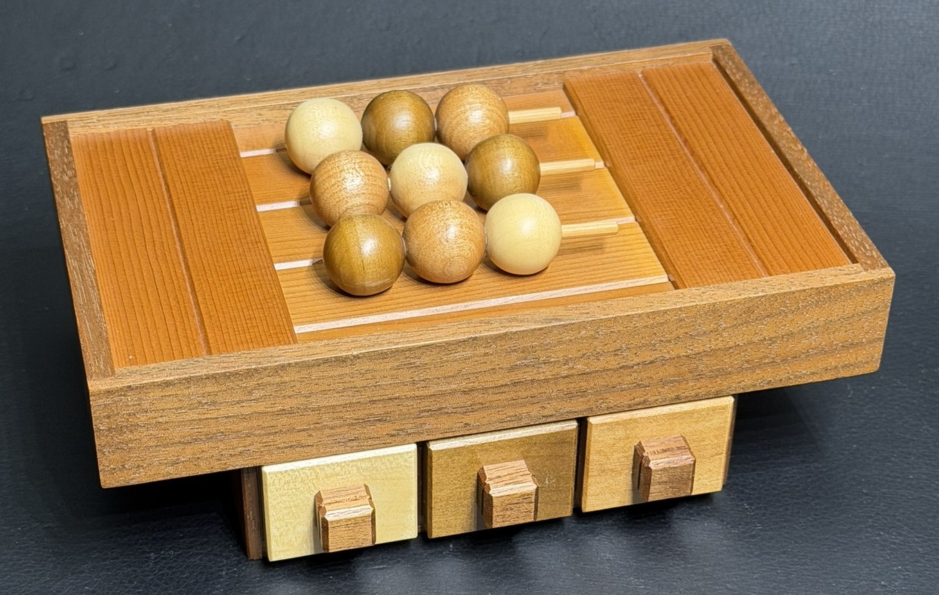 This box is as beautiful on the inside as it is on the outside!  I have solved it and reset it and it works great.Per the Karakuri website:Irregular open 4 times secret boxYoshiyuki NinomiyaITEMN-28Created11/2010Size(box body)91×117×60mmSize(storage part)*****Materialmagnoria, katsura, ilex, walnut, rengas, nigaki, camphor treeFacebookTwitter共有This work was designed as a Christmas present for 2010.This secret box is irregular and opens in 4 turns. This is an irregular open type secret box...