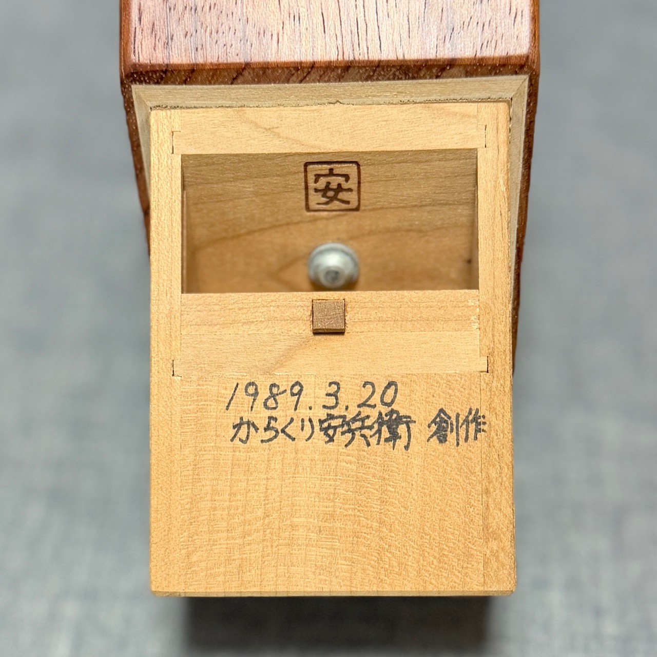 This Vary Box was created by Akio Kamei in 1989. Who is a Karakuri Creation Group’s master of craftsman. It is his his early masterpieces and features very interesting mechanism. A beautiful shape and grain of box as a piece of art. also it will be a perfect interior decorating item on your shelf.