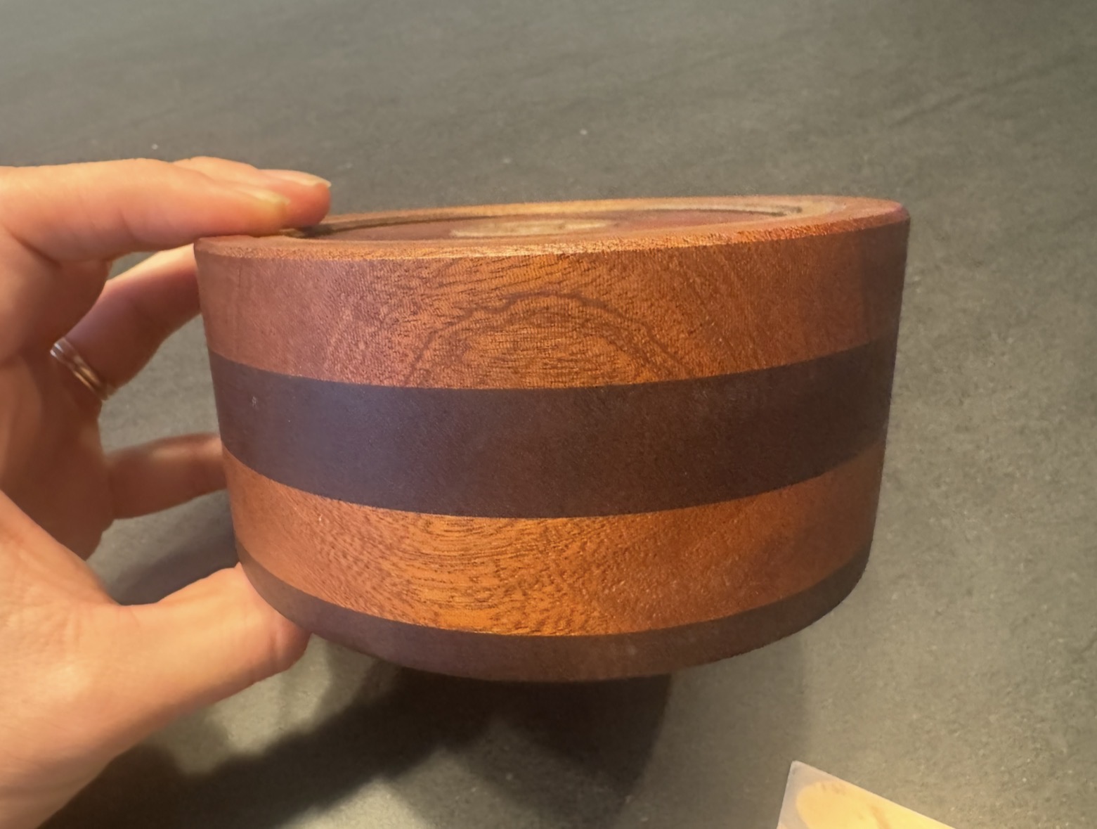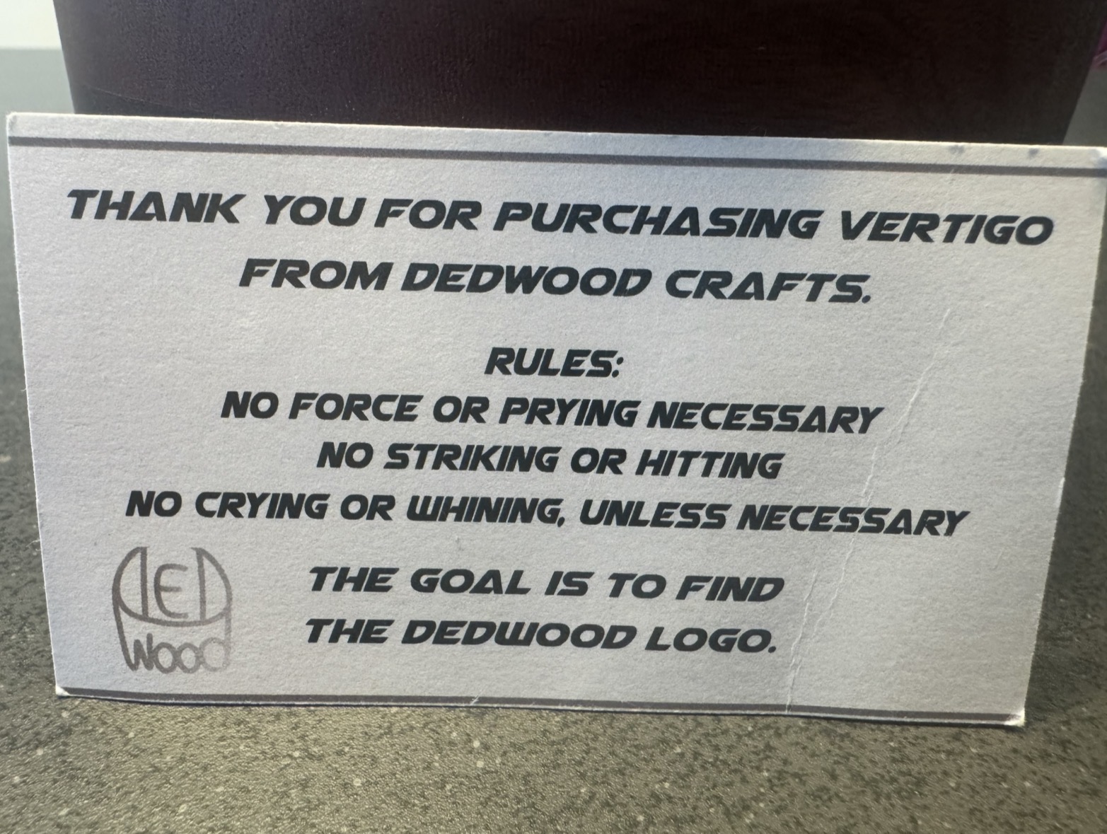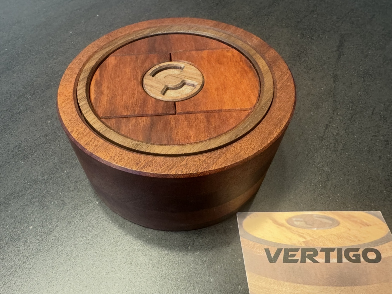 Utilizing your wits and determination, navigate your way through this 15 plus step sequential discovery puzzle to find the DEDwood Crafts logo and claim your victory. Vertigo is crafted using the beautiful woods of Goncalo alves (tigerwood), sapele and black walnut.  Puzzle dimensions are 5.5 inches x 2.5 inches.