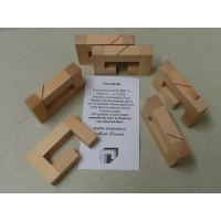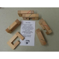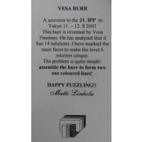 This 6-piece board burr has 14 solution, but only one solutions satisfies the color restraints, as described on the information card.